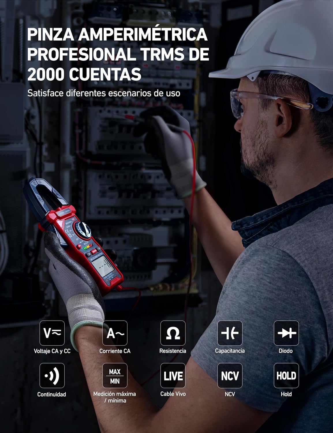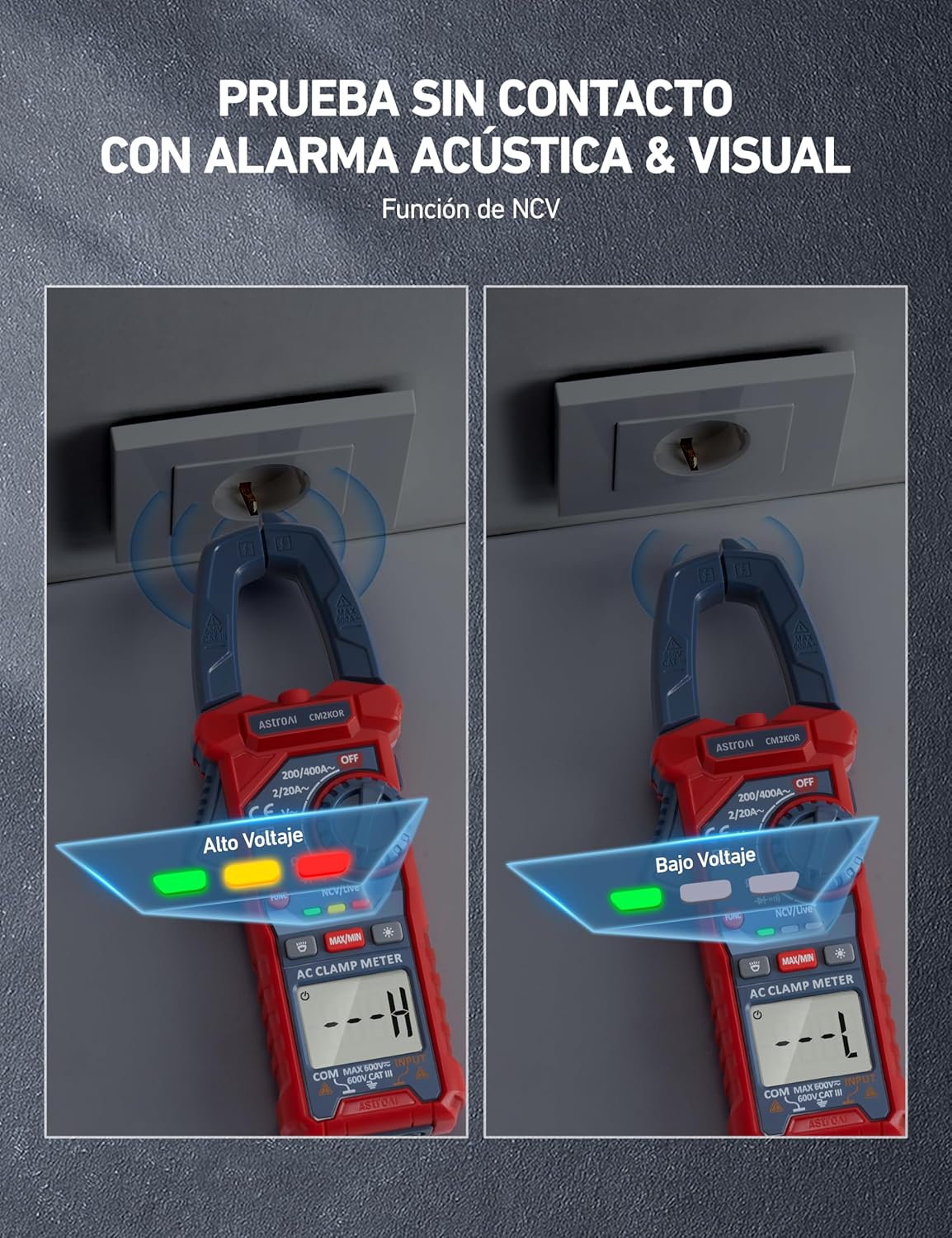 - Medición de corriente alterna (AC) y voltaje (AC/DC).