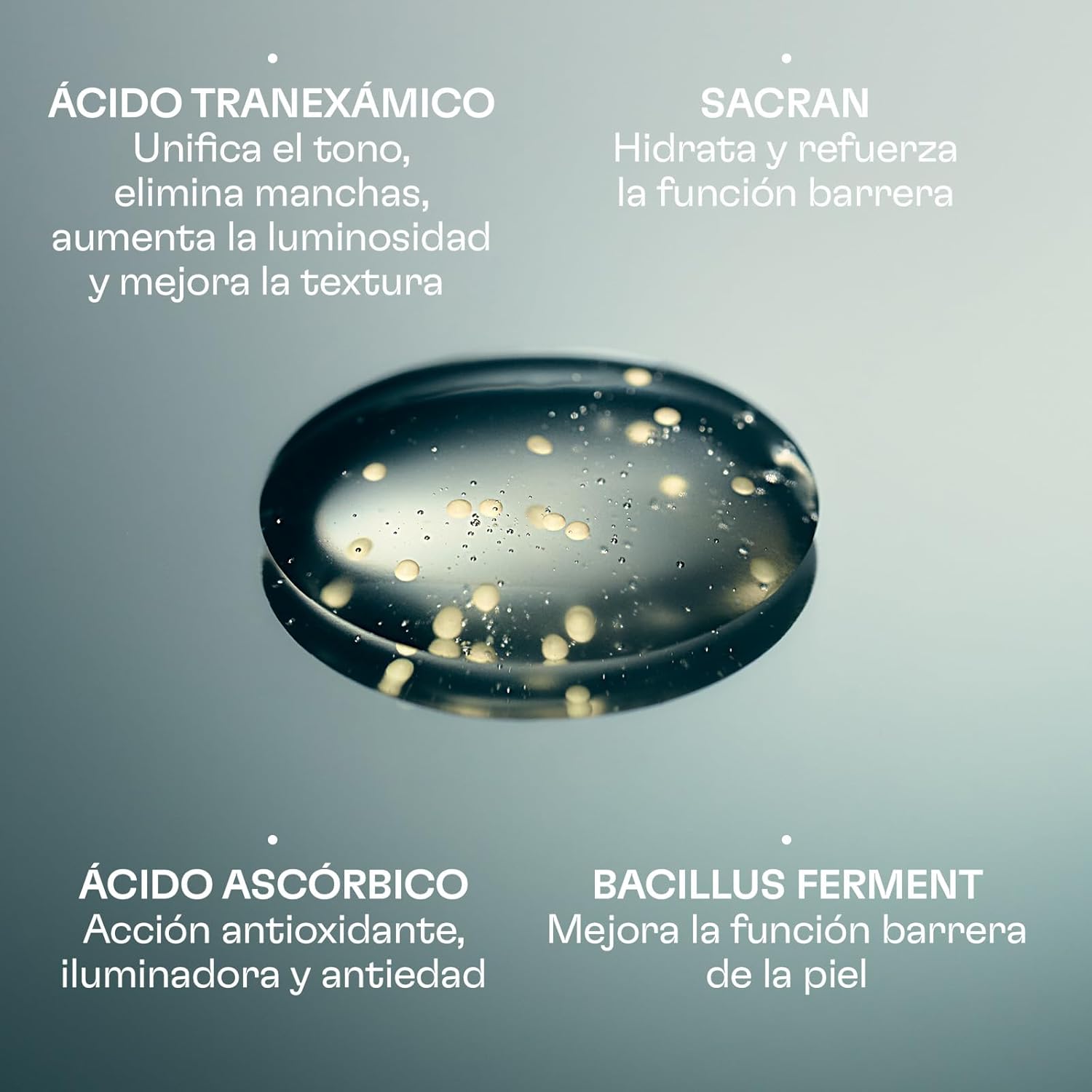 Los ingredientes principales incluyen vitamina C, ácido tranexámico, Sacran, Bacillus Ferment y extractos botánicos coreanos.