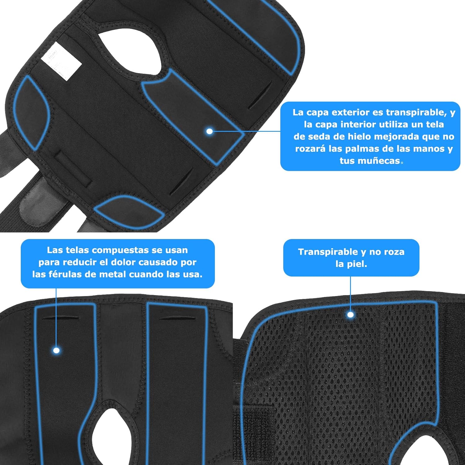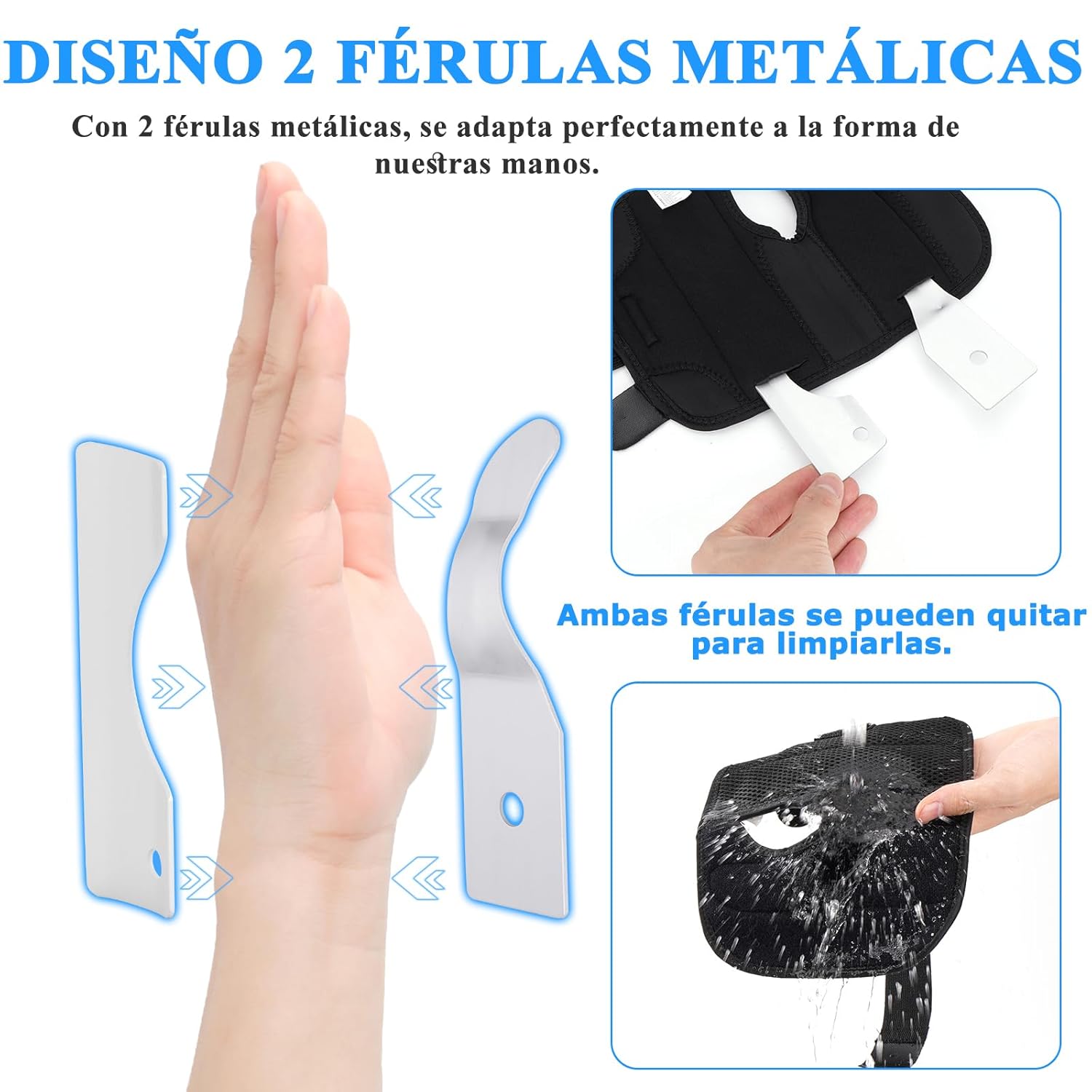 - Férulas ajustables que permiten personalizar el soporte.