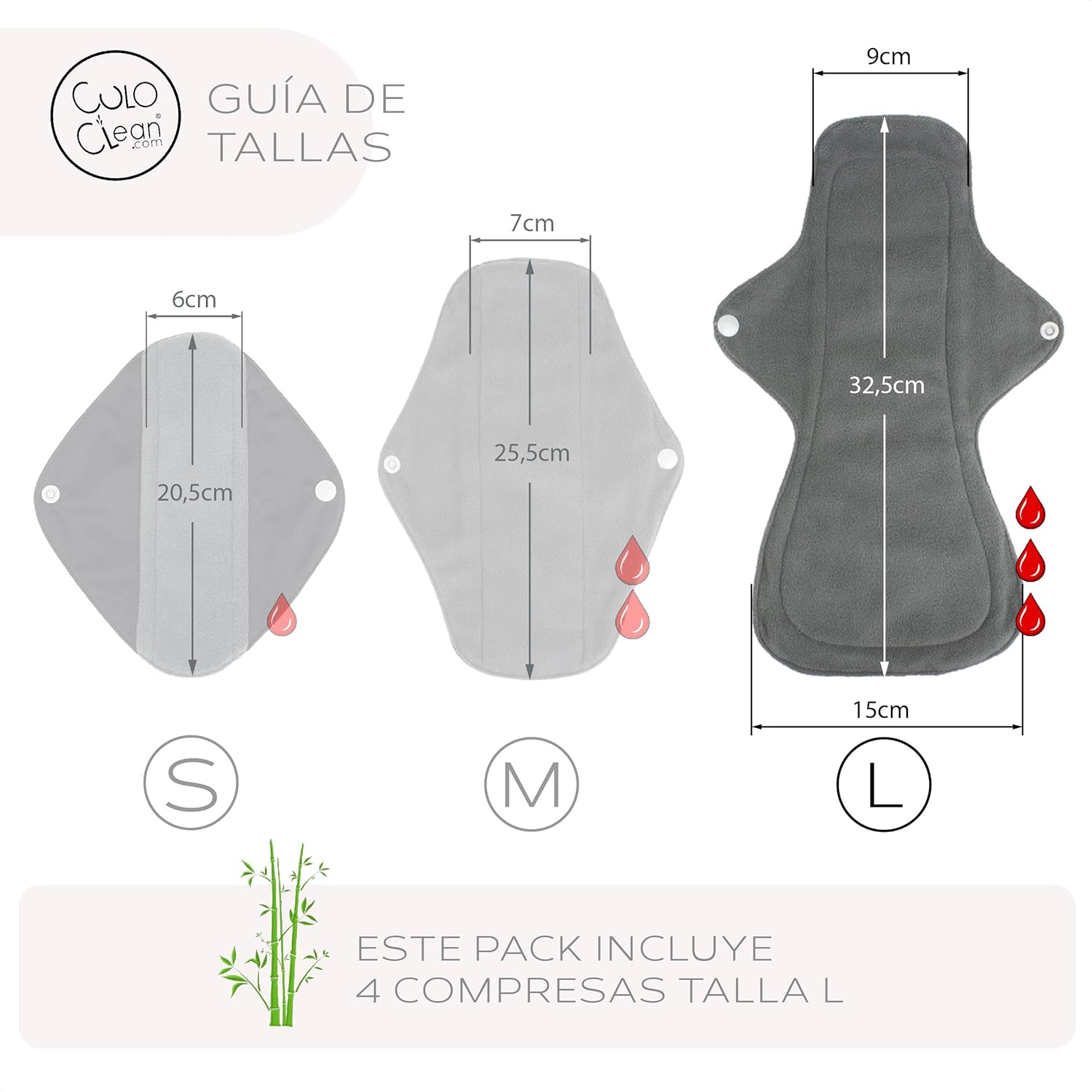 CuloClean 4pcs (L) Menstrual Pads for Night and Postpartum Reusable Bamboo Fiber Abundant Flow Large Eco-Friendly Breathable Waterproof Fabric + Bag + Portable Bidet