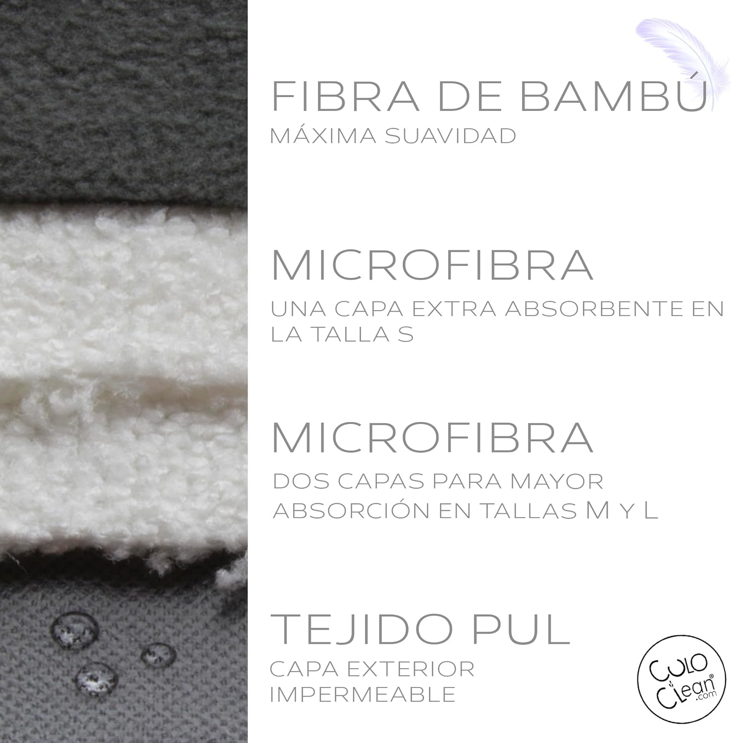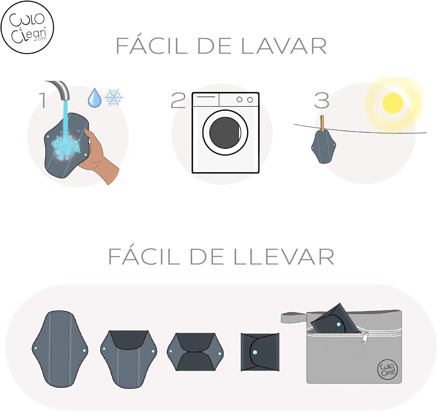 Las compresas reutilizables de bambú de CuloClean son una opción ecológica y económica para el cuidado menstrual y posparto. Hechas con una capa de carbón de bambú, estas compresas son suaves al tacto, transpirables y antifúngicas, lo que ayuda a controlar los olores. Además, su interior cuenta con una capa de microfibra que ofrece una mayor capacidad de absorción en comparación con las compresas desechables. La capa de tejido PUL garantiza una protección efectiva contra fugas sin sacrificar la comodidad.
