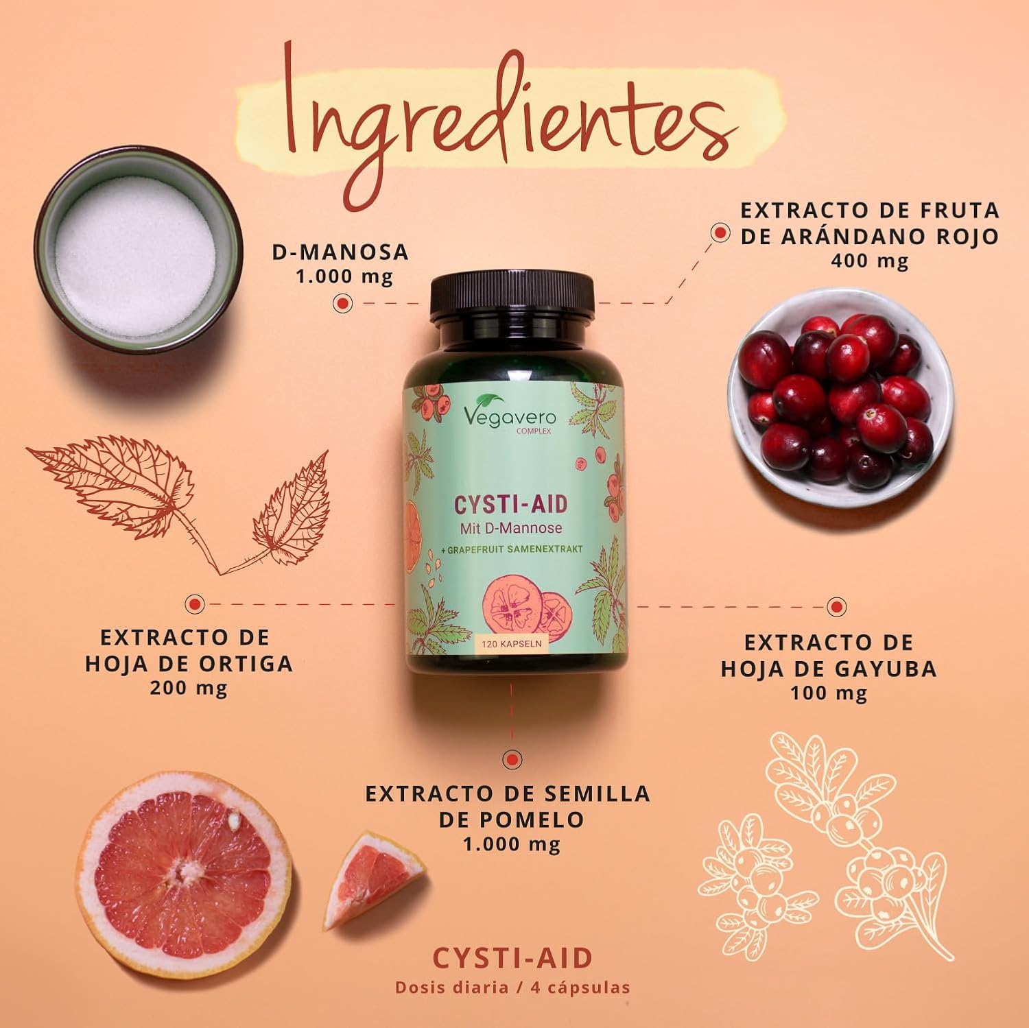 El Cystitis Relief Vegavero® es un suplemento natural diseñado para brindar apoyo en casos de infecciones urinarias. Este producto está formulado con ingredientes como D-Mannose, extracto de semilla de pomelo, arándano, ortiga y extracto de bearberry, todos conocidos por sus propiedades beneficiosas. Cada frasco contiene 120 cápsulas veganas, lo que lo convierte en una opción accesible y fácil de usar.