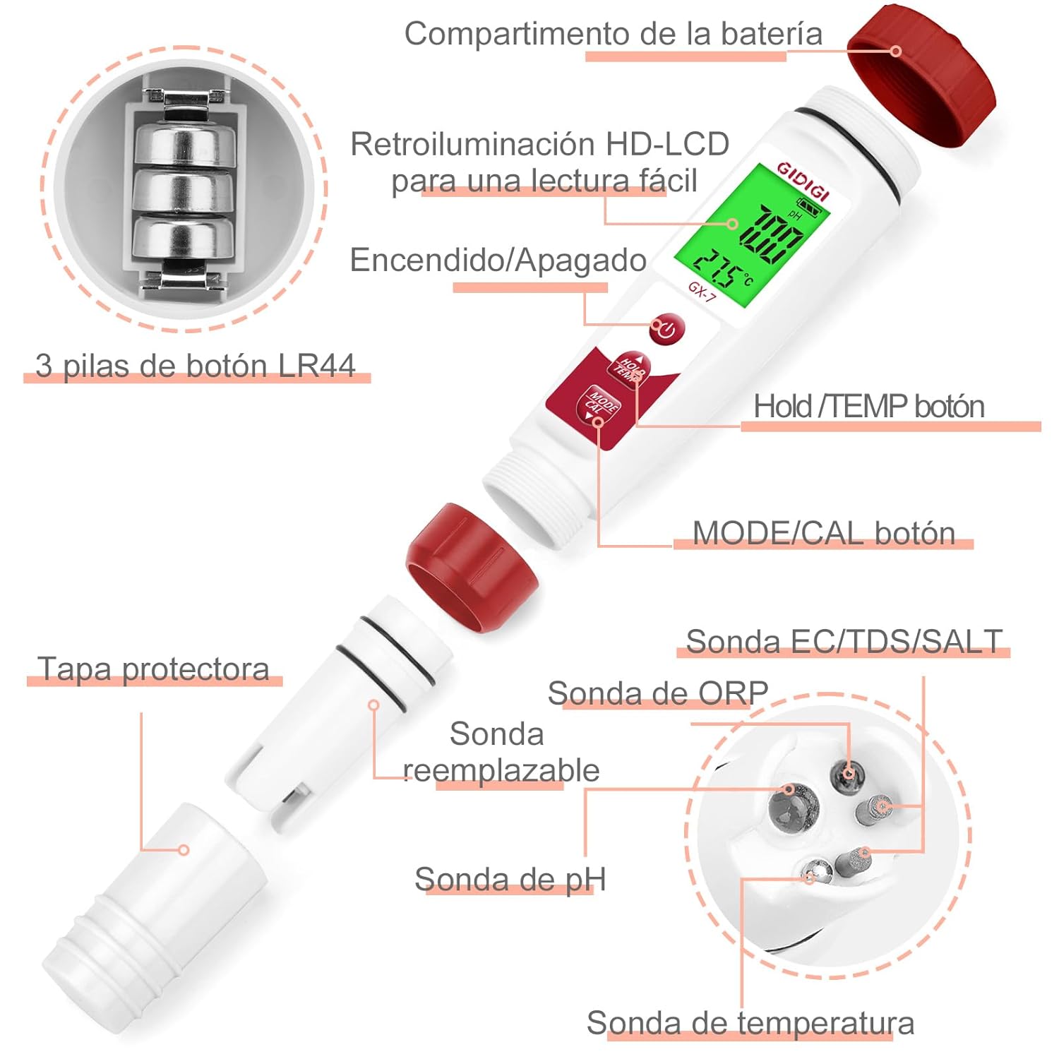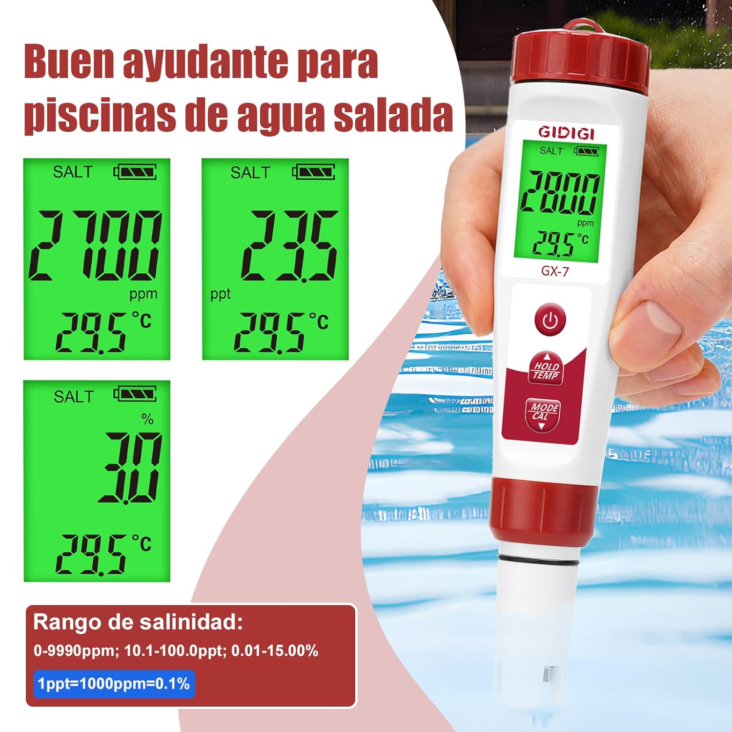 El Medidor Digital de Cloro y pH 7 en 1 es una herramienta esencial para mantener la calidad del agua en su piscina. Este dispositivo permite medir varios parámetros, asegurando un ambiente seguro y saludable. Entre sus características destacan: