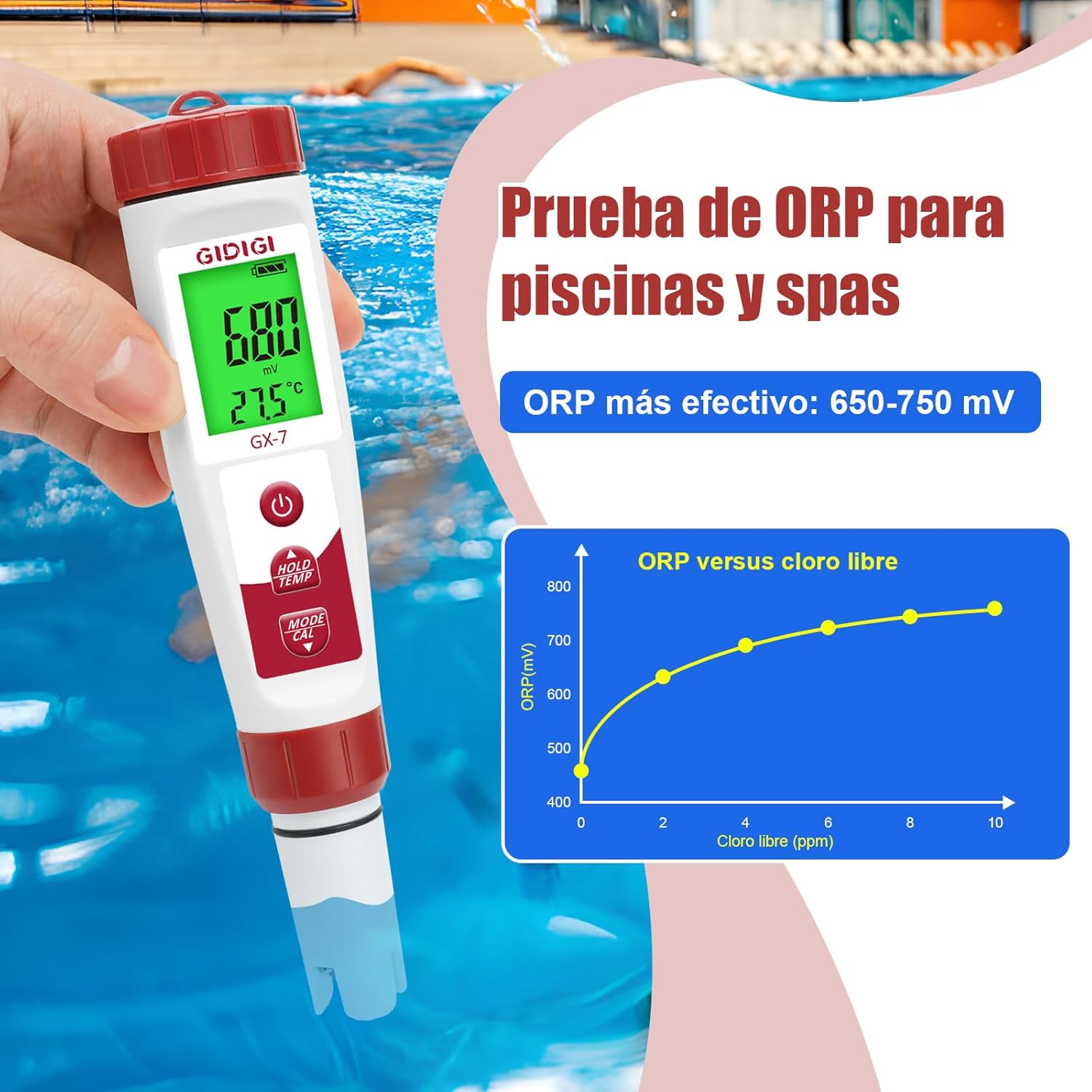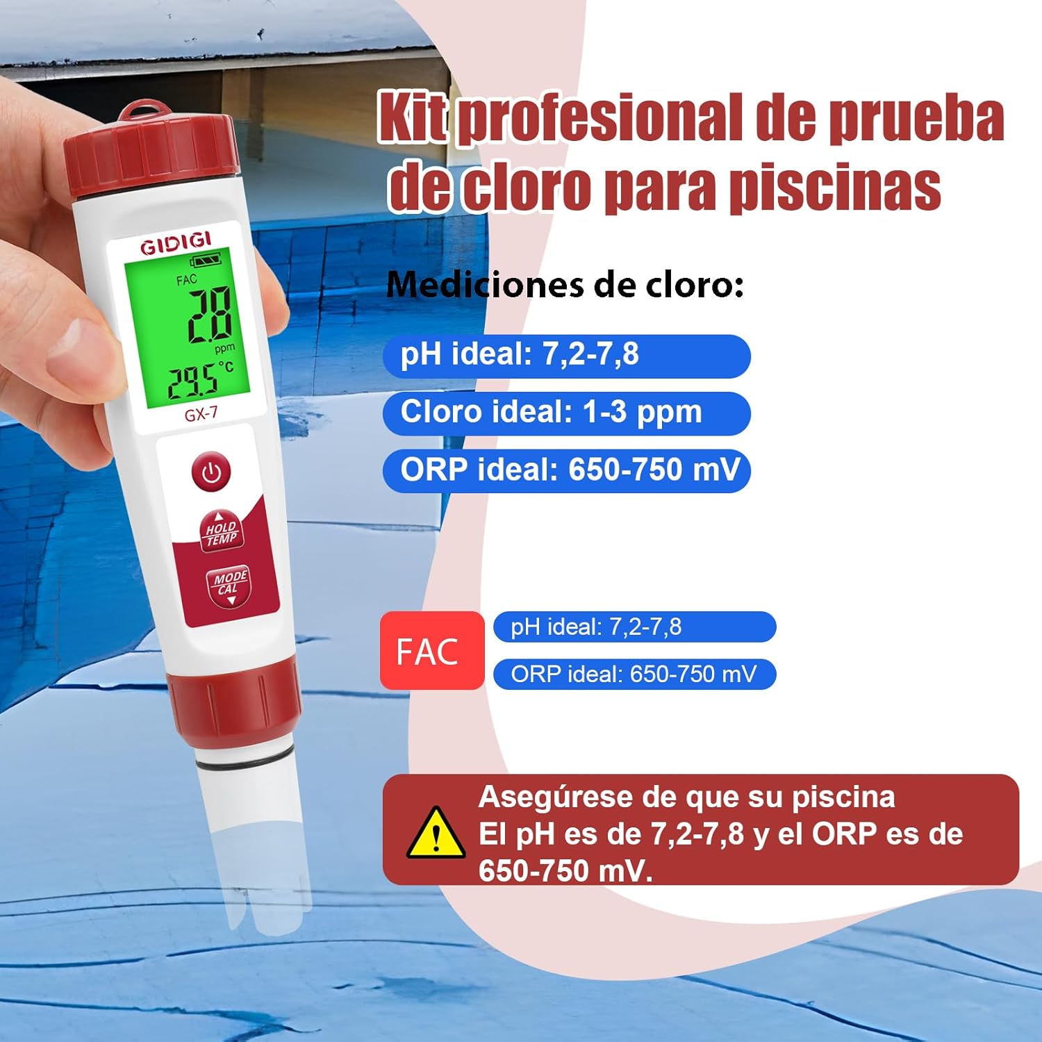 • Rangos ideales: pH 7,2-7,8; ORP 650-750 mV; cloro 1-3 ppm.