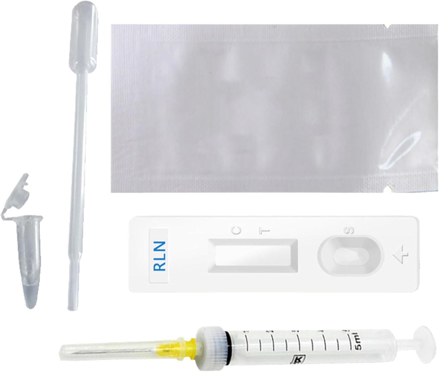 El kit incluye una prueba de embarazo para perros, una solución tampón, un gotero y una jeringa.