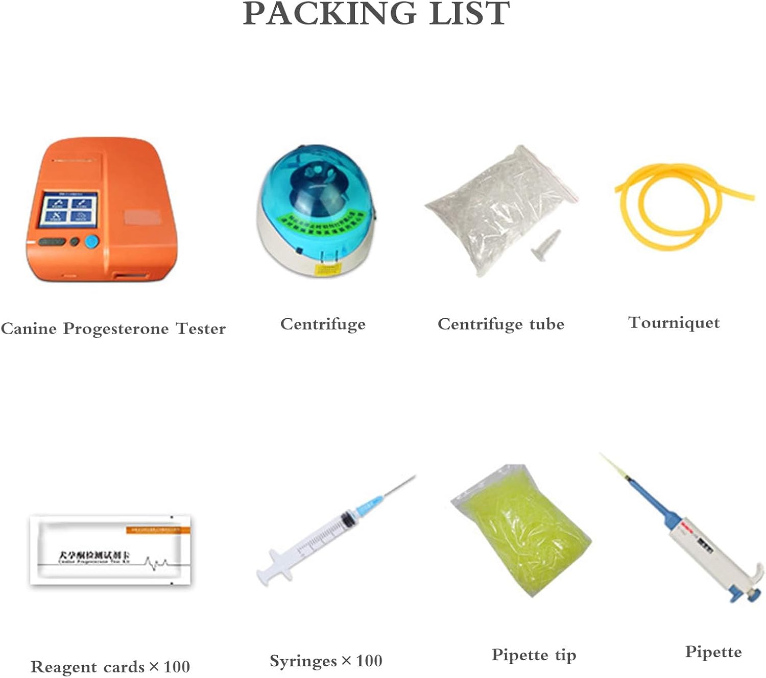 El paquete incluye un Tester de Progesterona Canina, una centrífuga, un tubo de centrífuga, un torniquete, una tarjeta de reactivo, 100 jeringas, 100 puntas de pipeta y una pipeta.