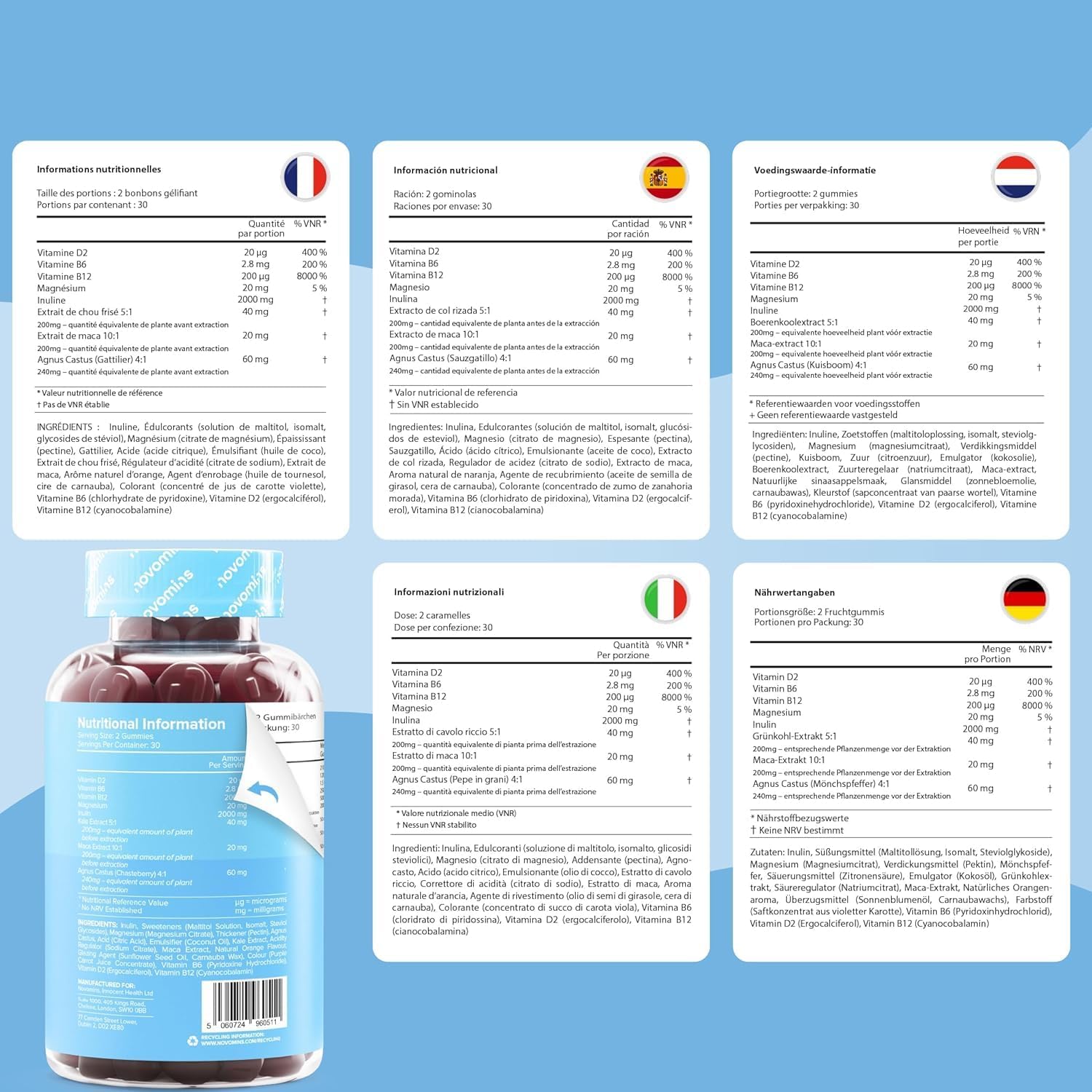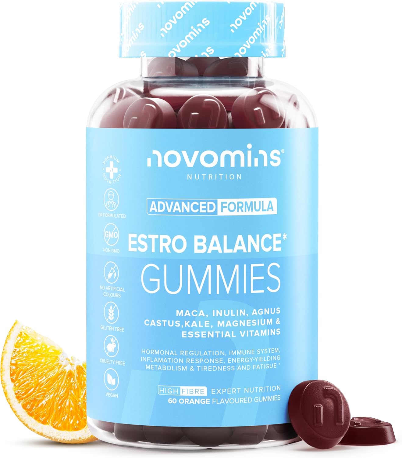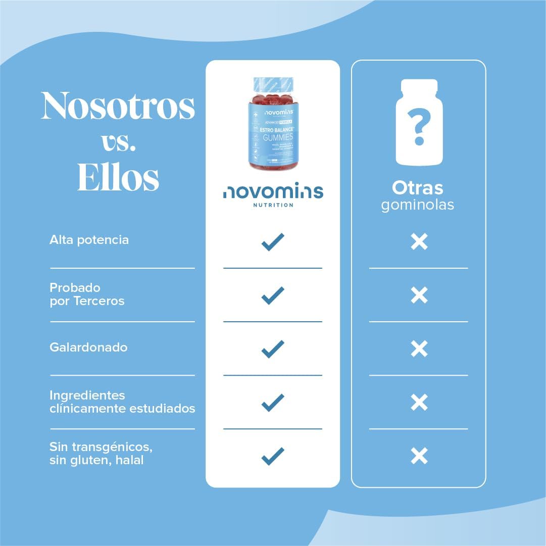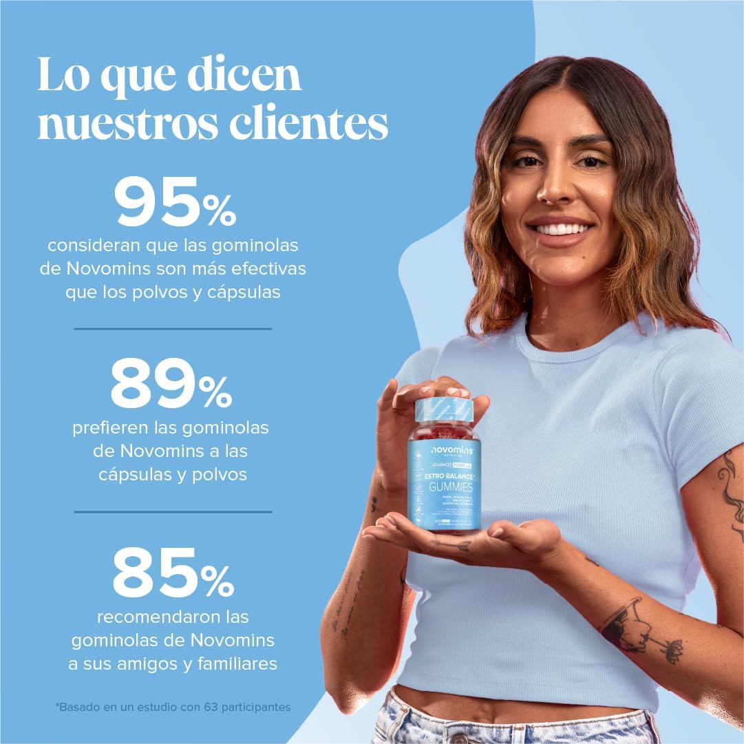 Los gummies de Female Estrogens de Novomins están diseñados para ayudar a mantener el equilibrio hormonal y los niveles de estrógeno en mujeres. Este producto es vegano y libre de gluten, lo que lo hace accesible para una variedad de dietas. Contiene ingredientes como vitamina D, B6, B12, maca y extracto de repollo, así como inulina, lo que puede contribuir a una salud hormonal general. A continuación, algunos puntos destacados: