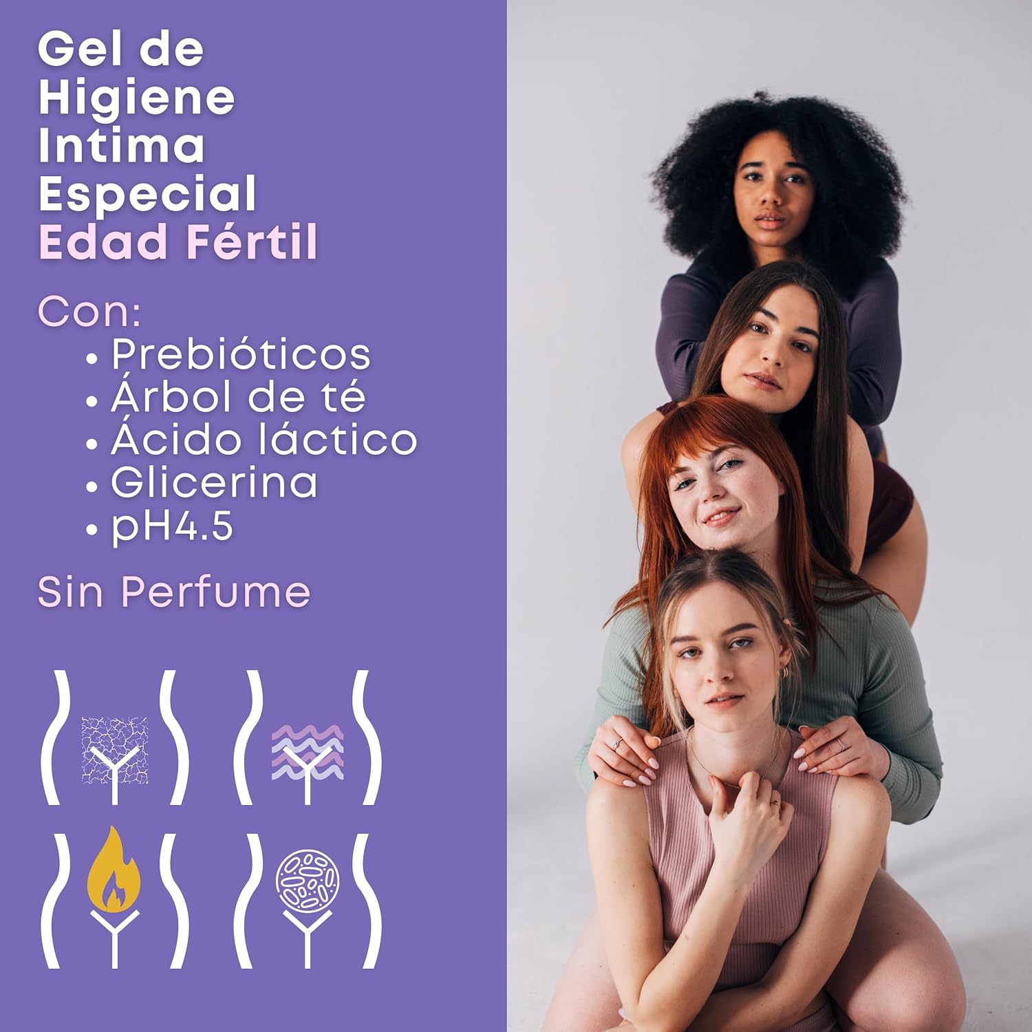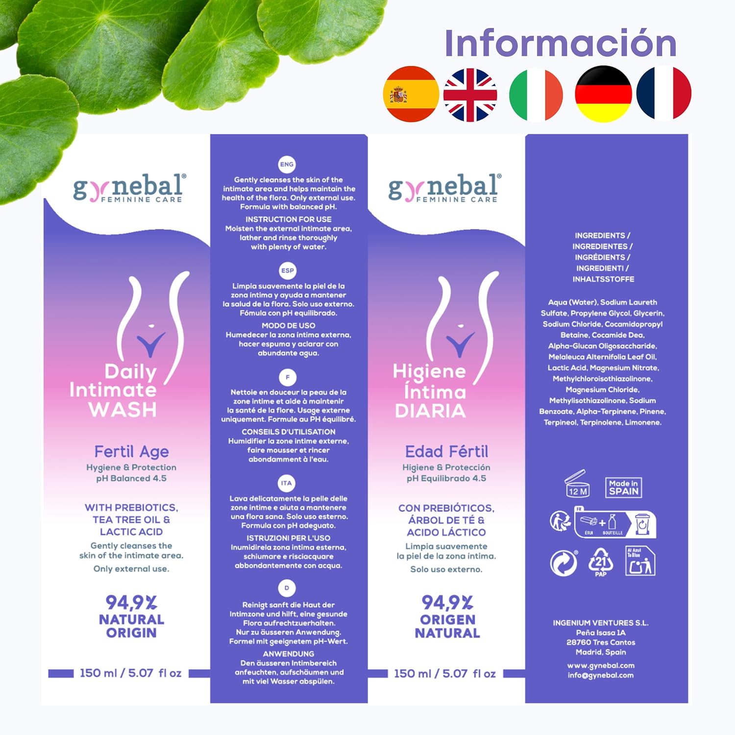 GYNEBAL es un gel de higiene íntima diseñado específicamente para mujeres en edad fértil. Su fórmula con pH 4.5 incluye ingredientes como el aceite de árbol de té, prebióticos y ácido láctico, que ayudan a mantener un equilibrio saludable en la flora vaginal. Este producto es ideal para: