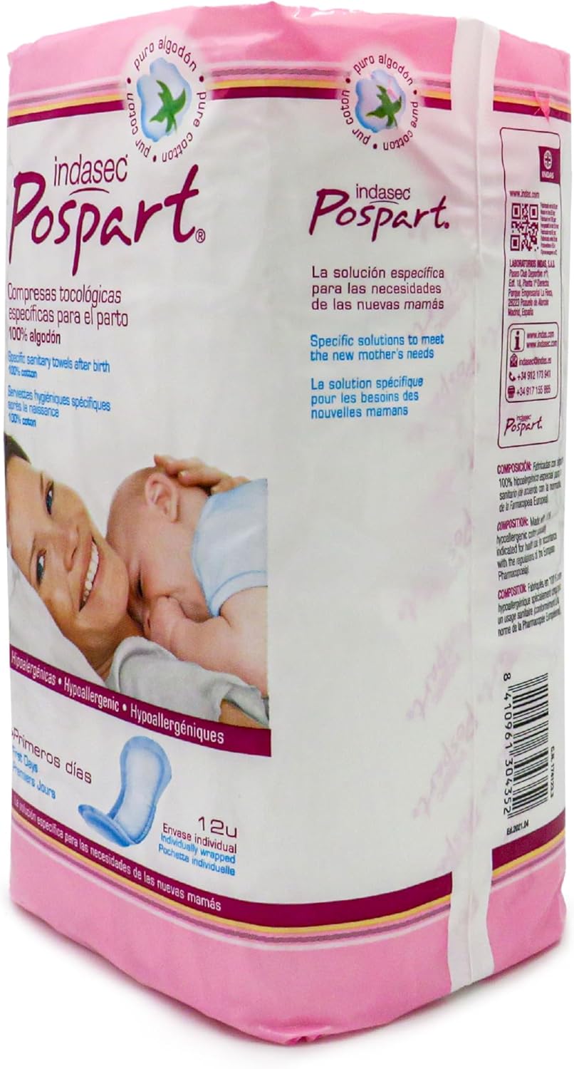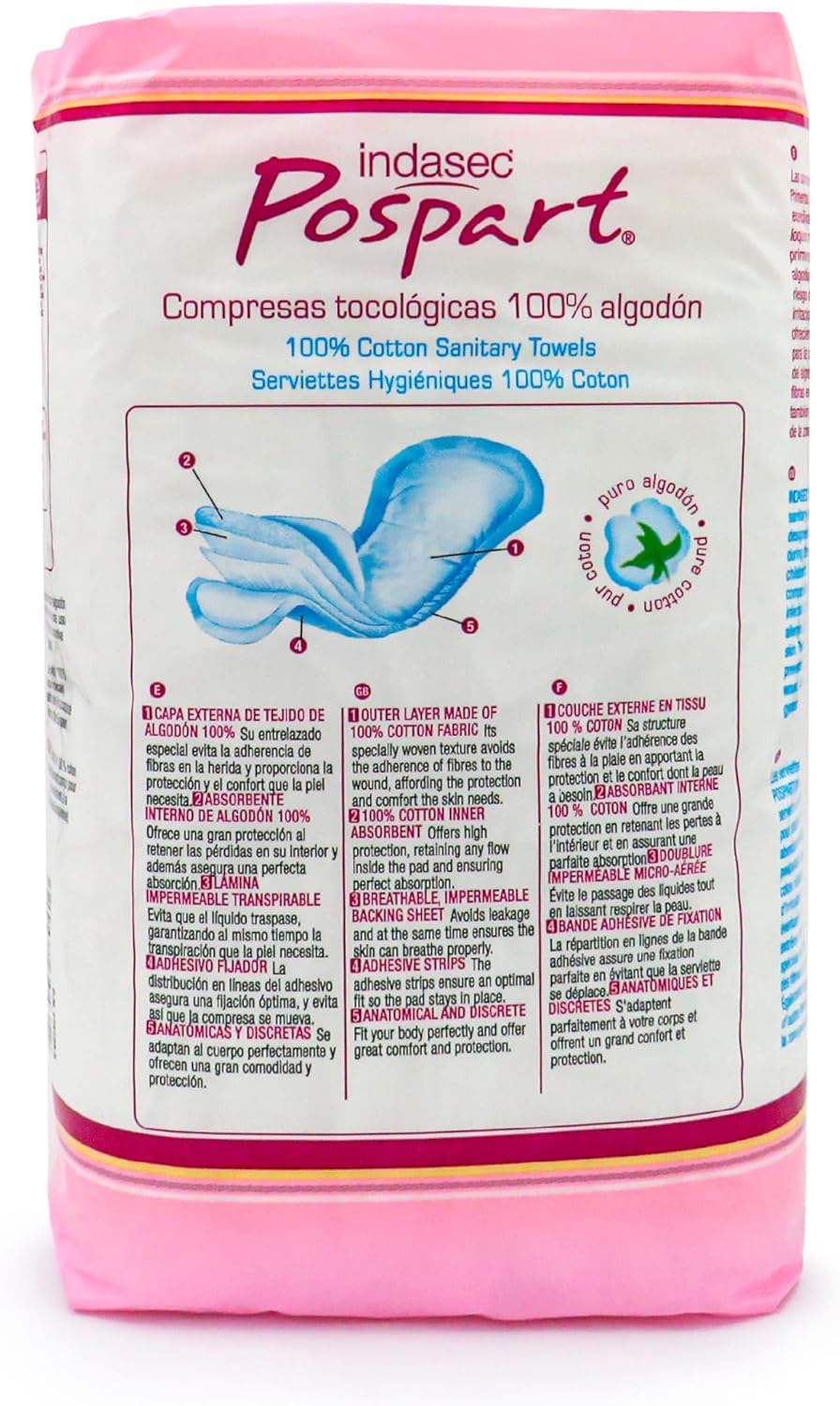 Indasec 100% Cotton Tocological Postpartum Pads – 12 Sanitary Towels – Hypoallergenic