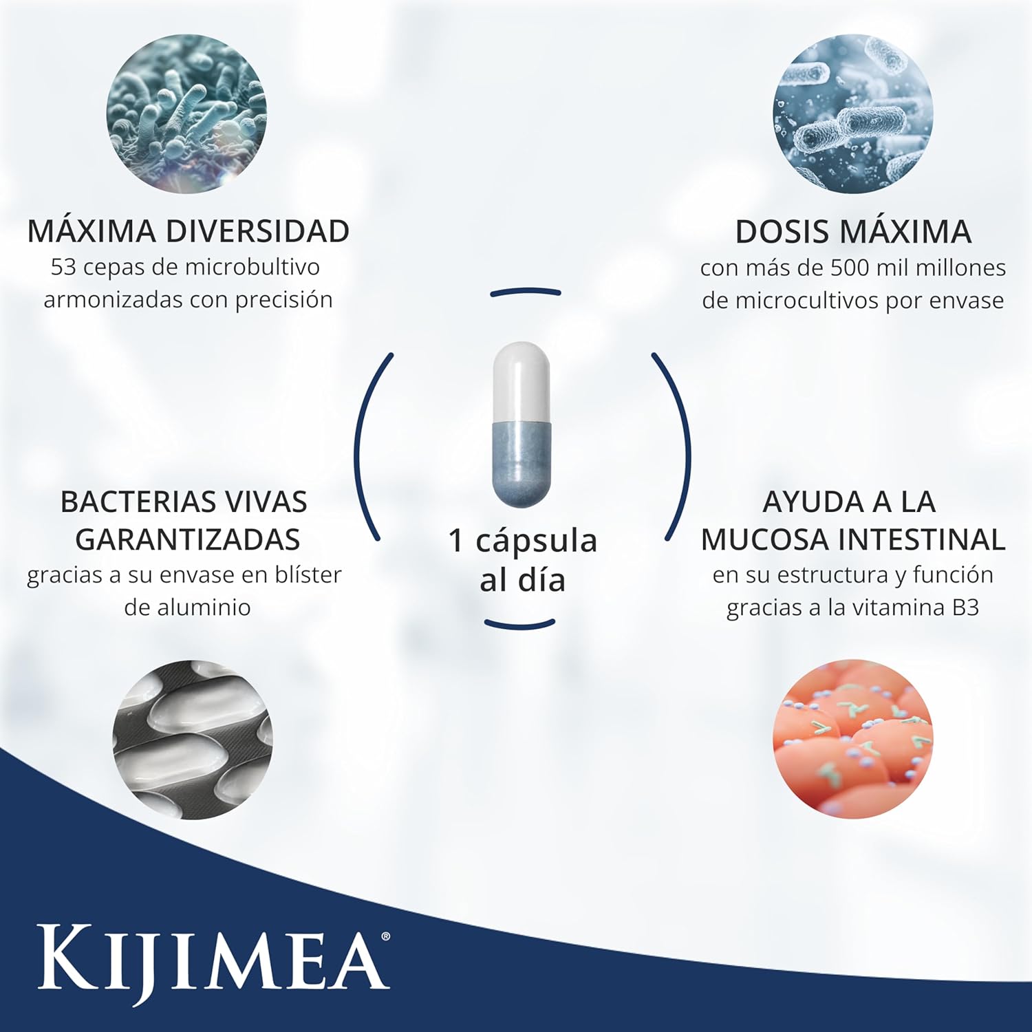 Kijimea K53 está diseñado para apoyar la salud intestinal mediante la provisión de cepas de bacterias beneficiosas.
