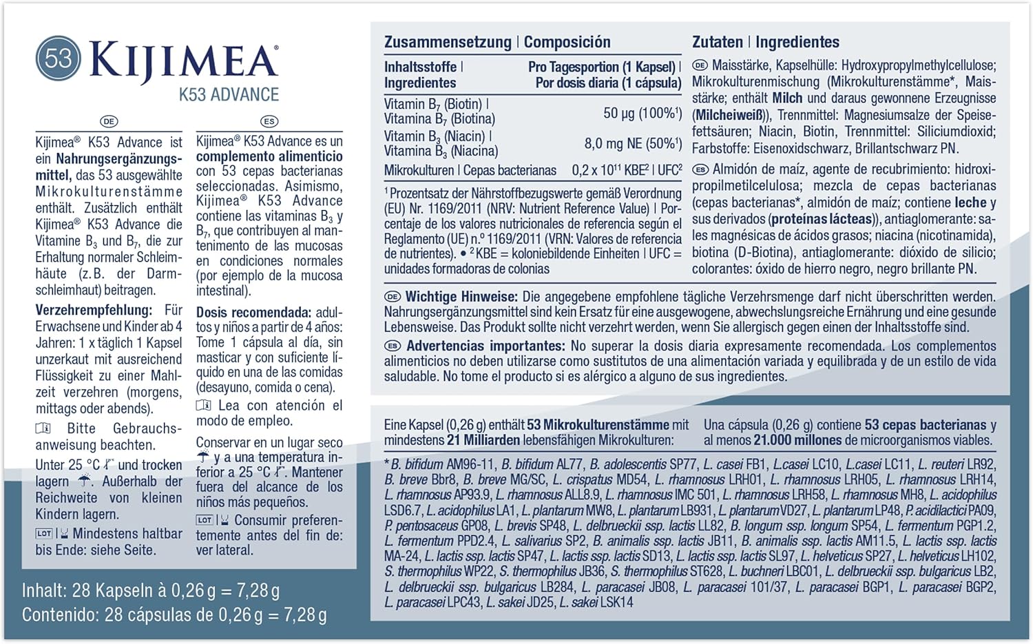 Kijimea K53 Advance es un suplemento de probióticos que ofrece una mezcla de 53 cepas seleccionadas de microculturas de flora intestinal. Cada paquete contiene más de 500 mil millones de CFU y 28 cápsulas, lo que lo convierte en una opción conveniente para quienes buscan mejorar su salud digestiva. Este producto también incluye biotina, un nutriente que apoya el metabolismo y la salud de la piel.