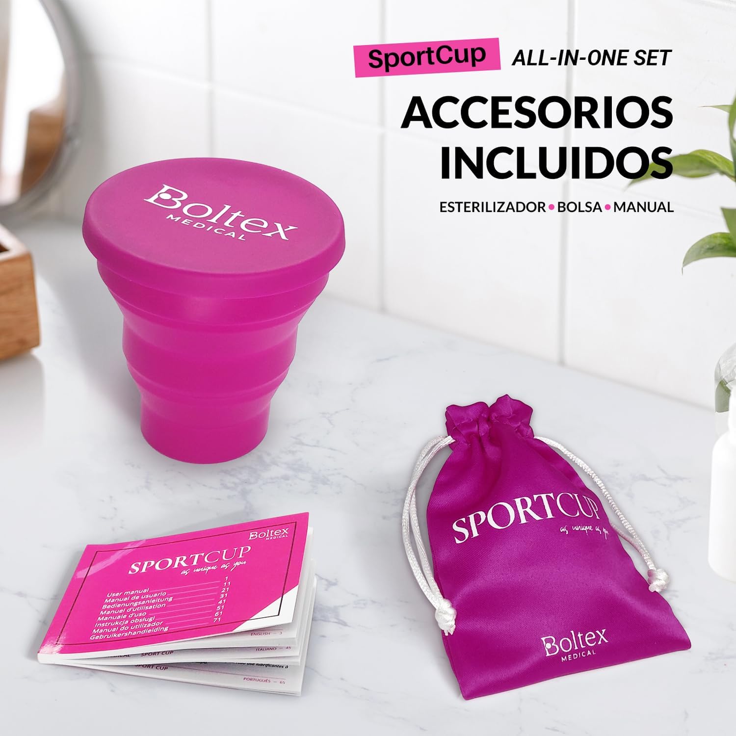 Menstrual Cup SPORT CUP ALL-IN-ONE SET by BOLTEX MEDICAL. Designed for Active Women. Includes Sterilizer Cup, 3 SPORT Cup Menstrual Cups: Size S, Size M, Size L and Storage Bag