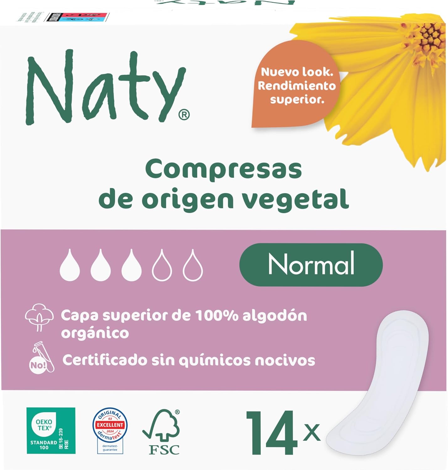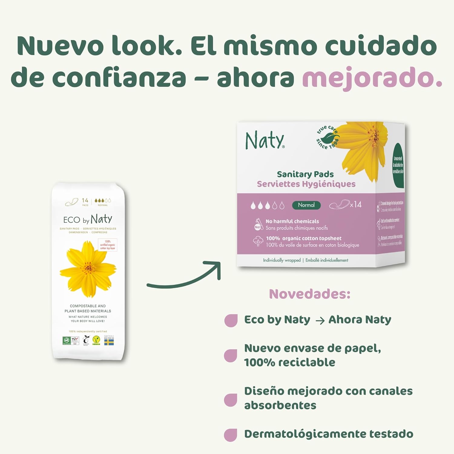 Cada paquete contiene 14 compresas Naty normales sin alas.