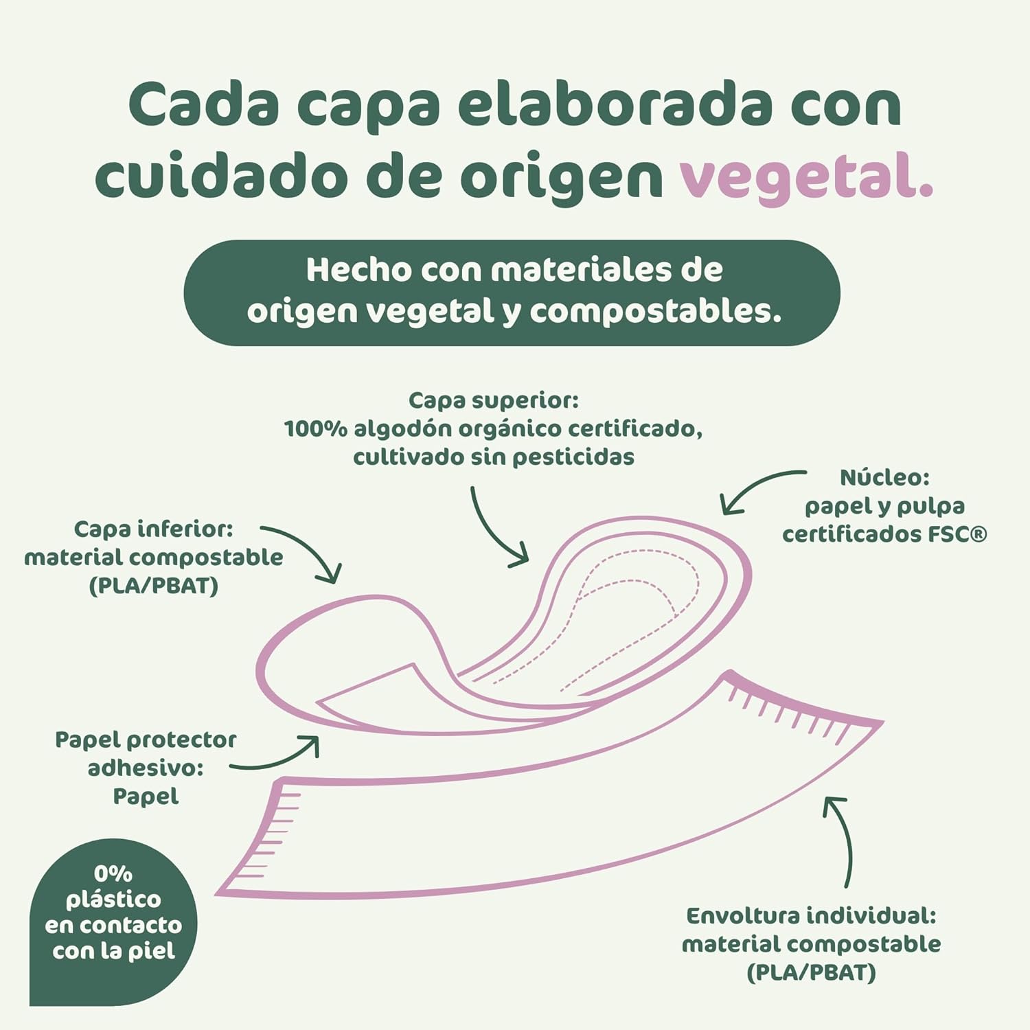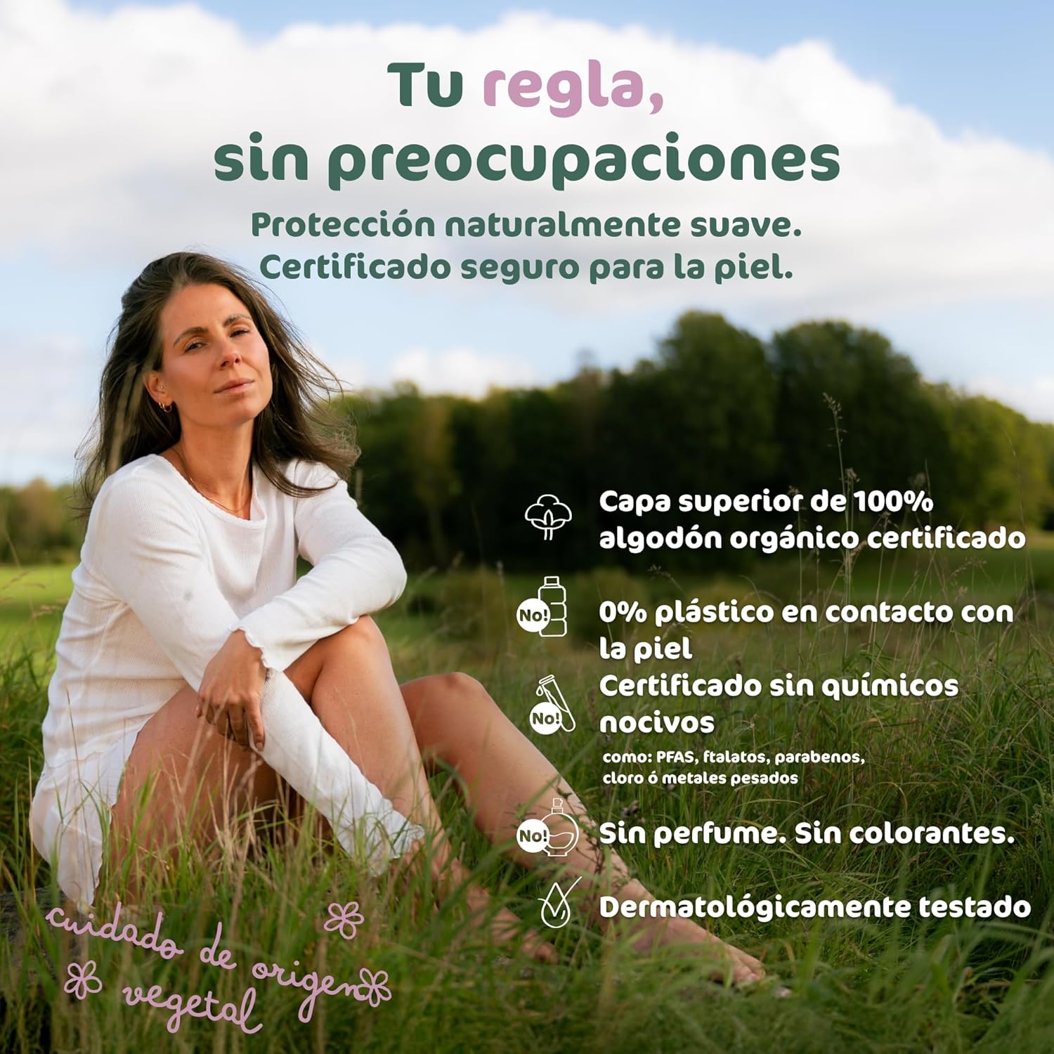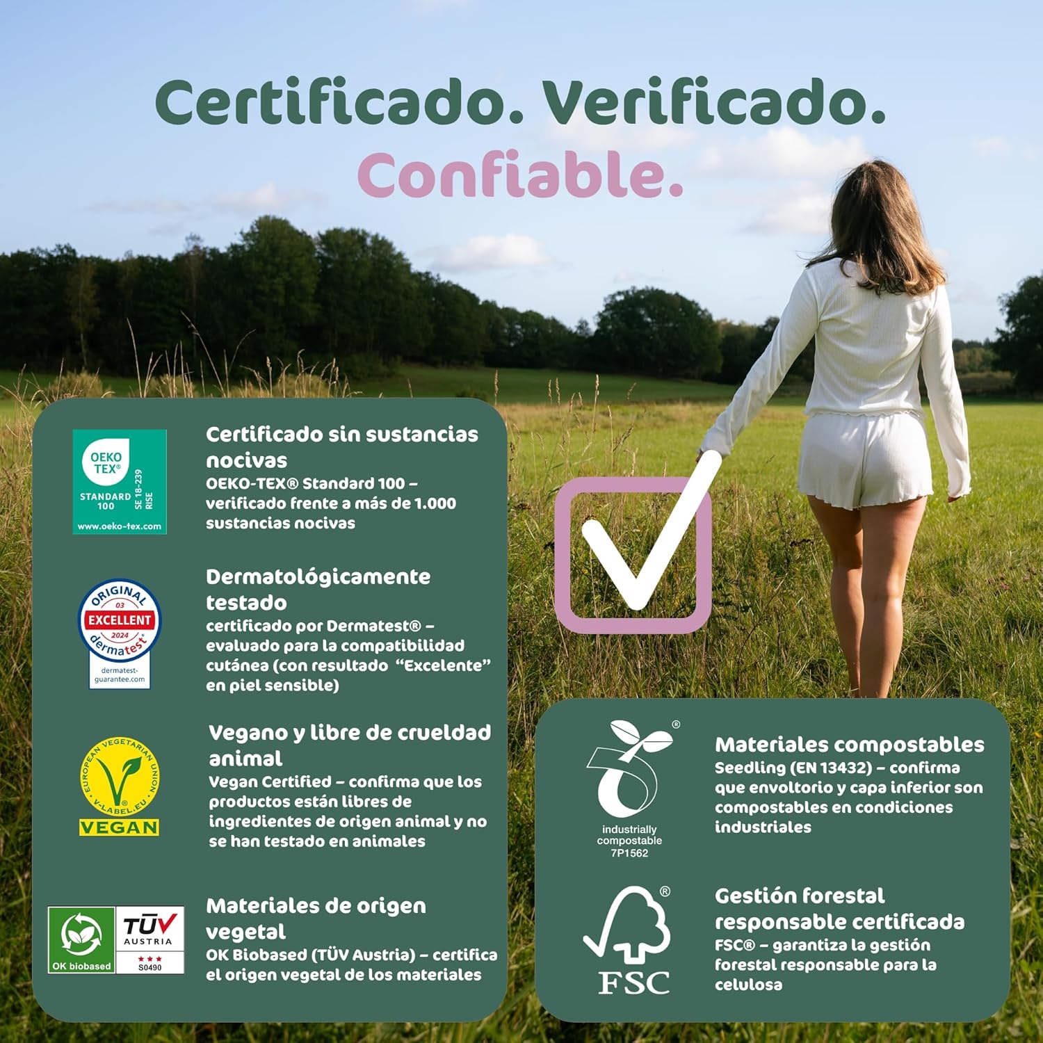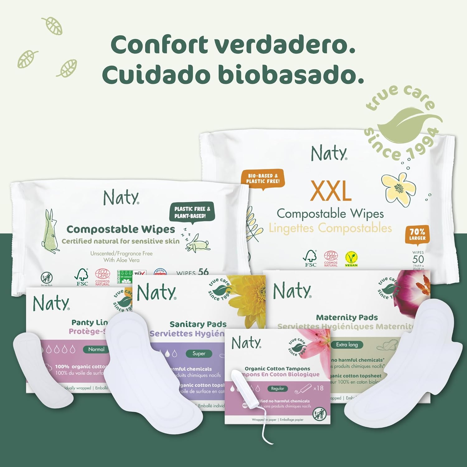 Las compresas Naty están hechas de algodón orgánico certificado, sin plásticos convencionales, perfumes, tintes ni aditivos innecesarios.