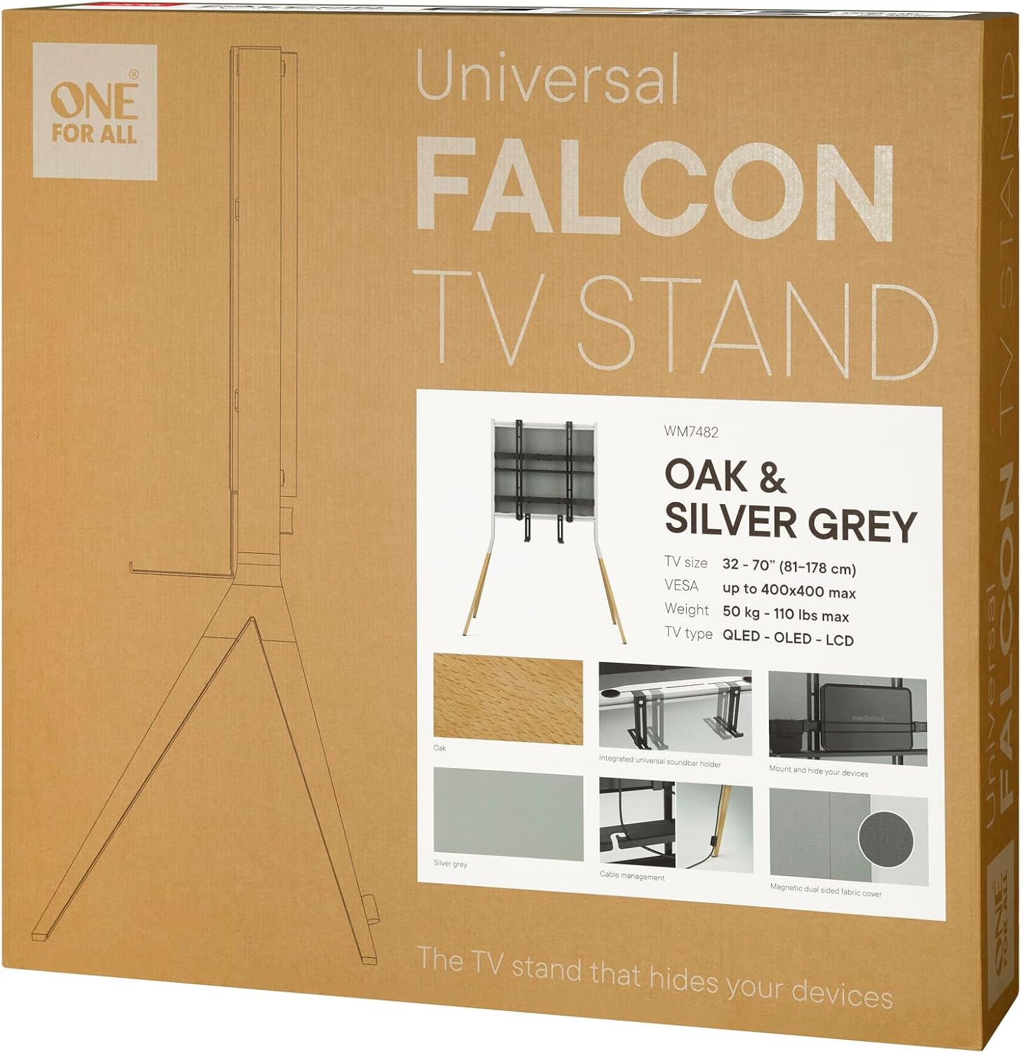 One For All Universal TV Stand – Screens from 32 to 70 Inches – LCD/LED/Plasma/OLED/QLED TVs – VESA 400×400 – Built-in Soundbar Mount – Elegant Design – WM7482