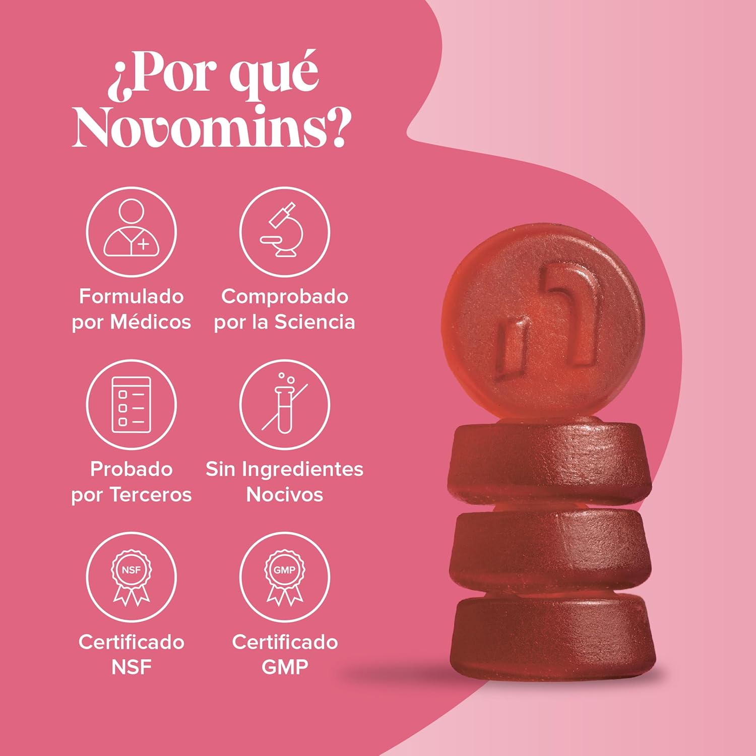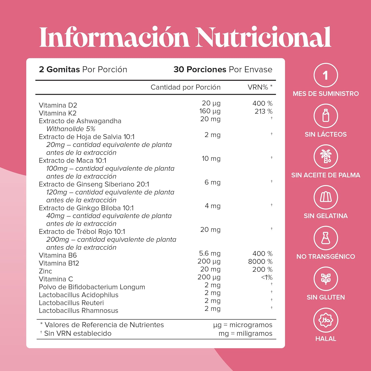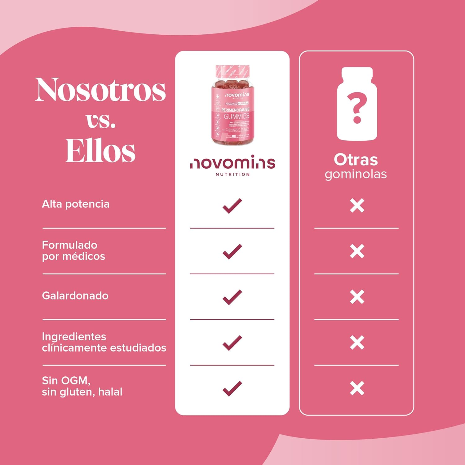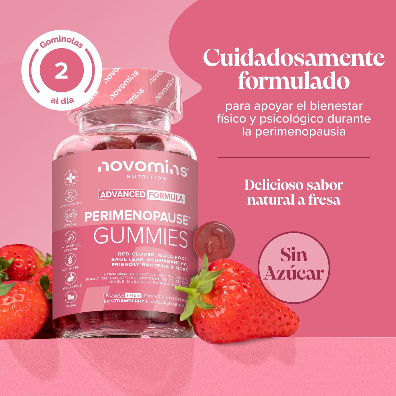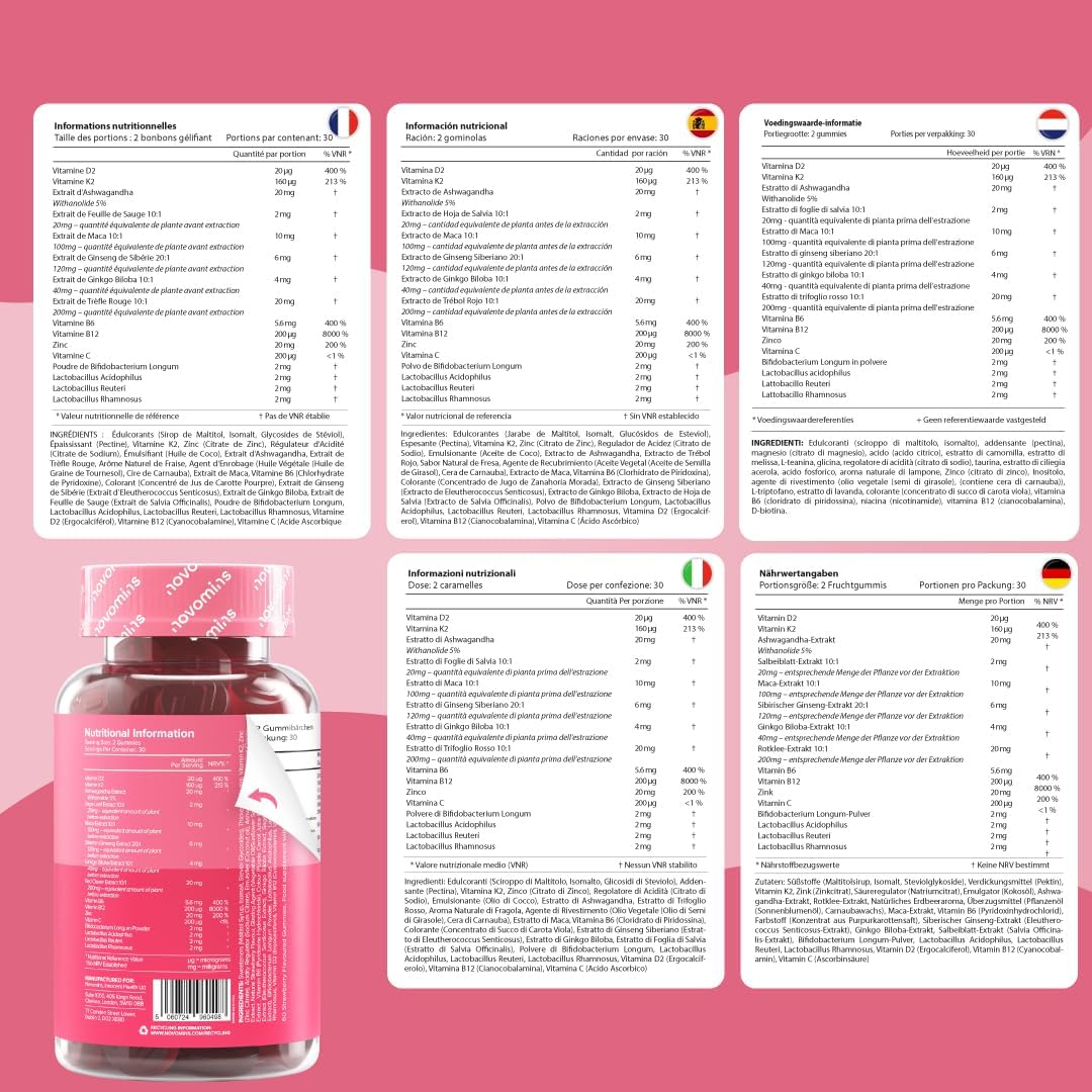 El suplemento para la perimenopausia de Novomins ofrece una combinación de ingredientes naturales diseñados para apoyar el equilibrio hormonal en las mujeres. Cada frasco contiene 60 gomitas que son libres de azúcar y están formuladas con maca, trébol rojo, salvia, probióticos y ashwagandha. Estos ingredientes pueden ayudar a aliviar algunos de los síntomas asociados con la perimenopausia y la menopausia.