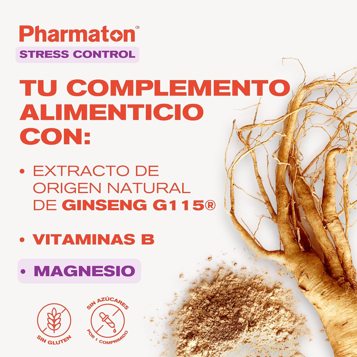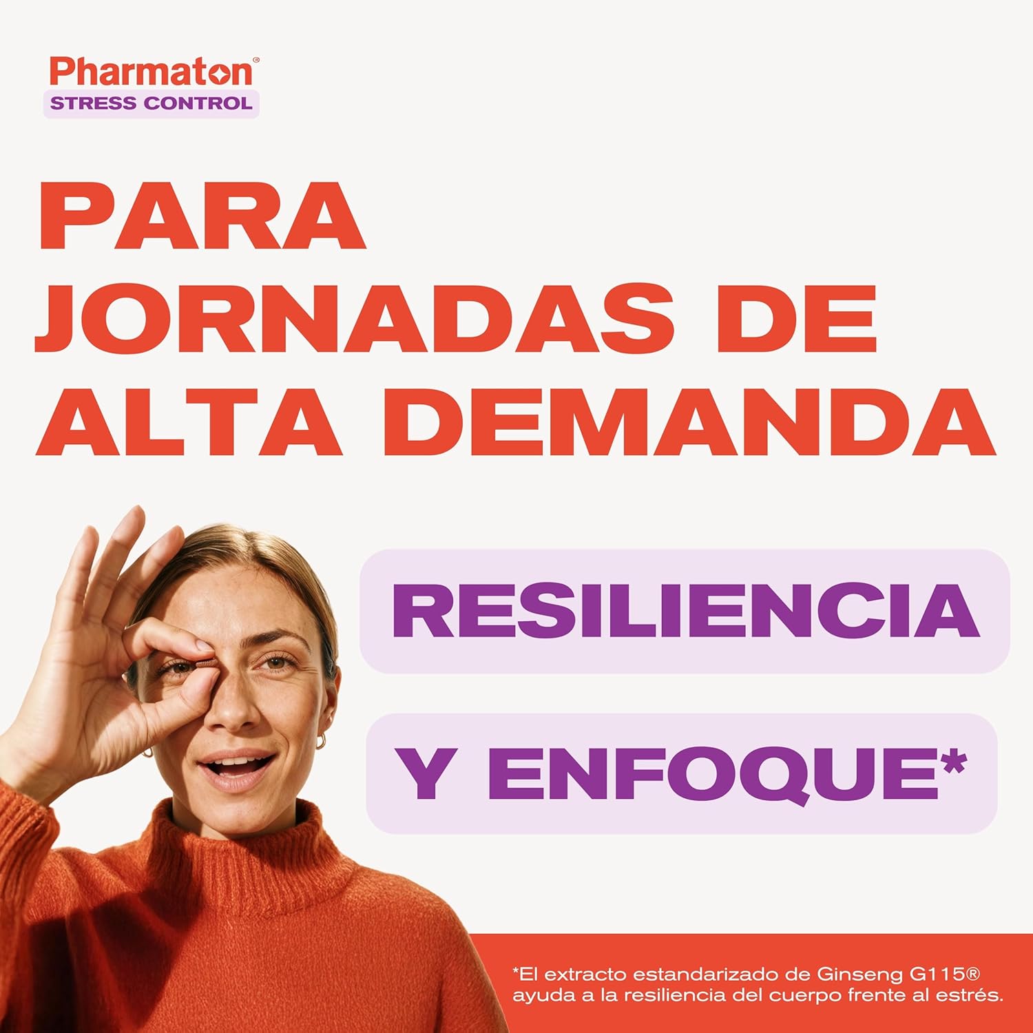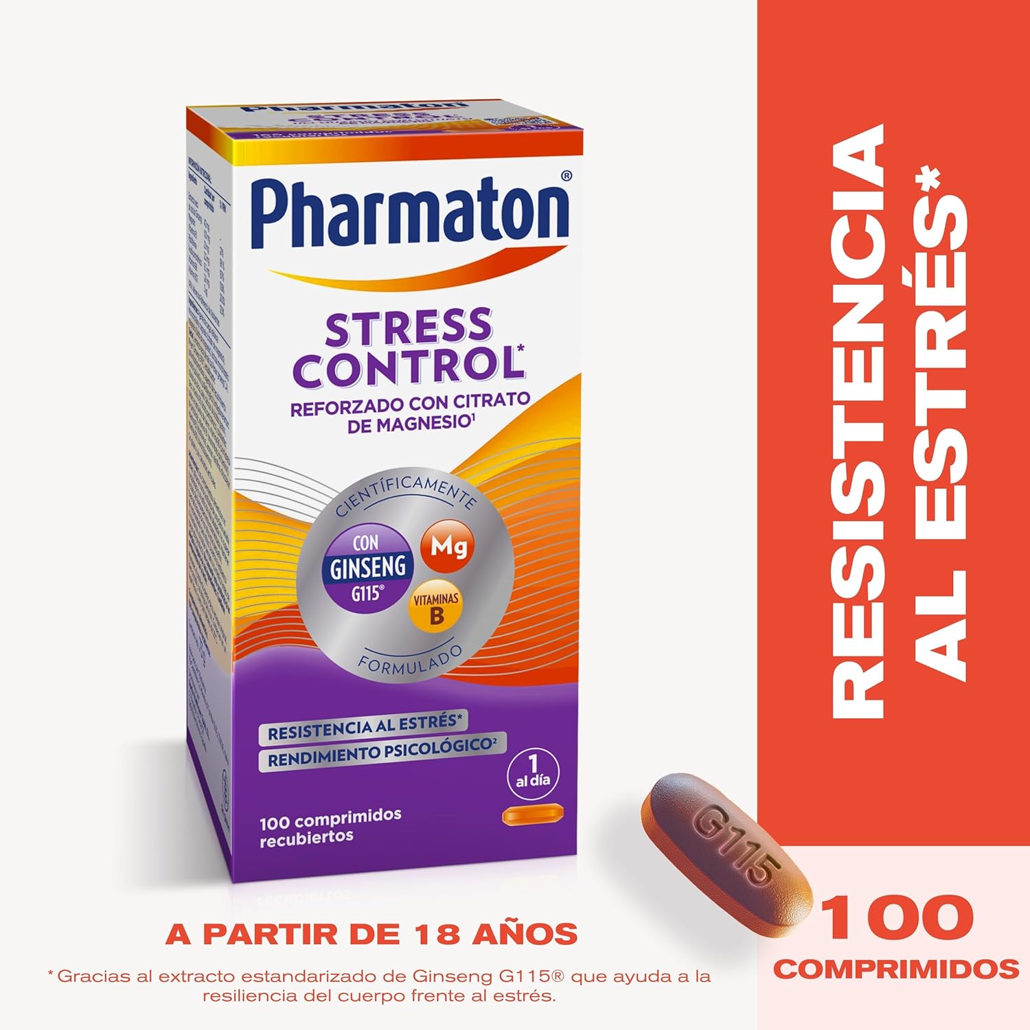 Pharmaton® Stress Control es un suplemento nutricional diseñado para ayudar a manejar el estrés diario. Este producto contiene Ginseng G115®, que es conocido por sus propiedades adaptogénicas, así como Magnesio y vitaminas del grupo B. Estas sustancias trabajan en conjunto para apoyar el bienestar general y la salud mental.