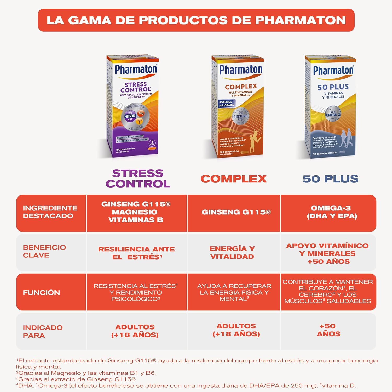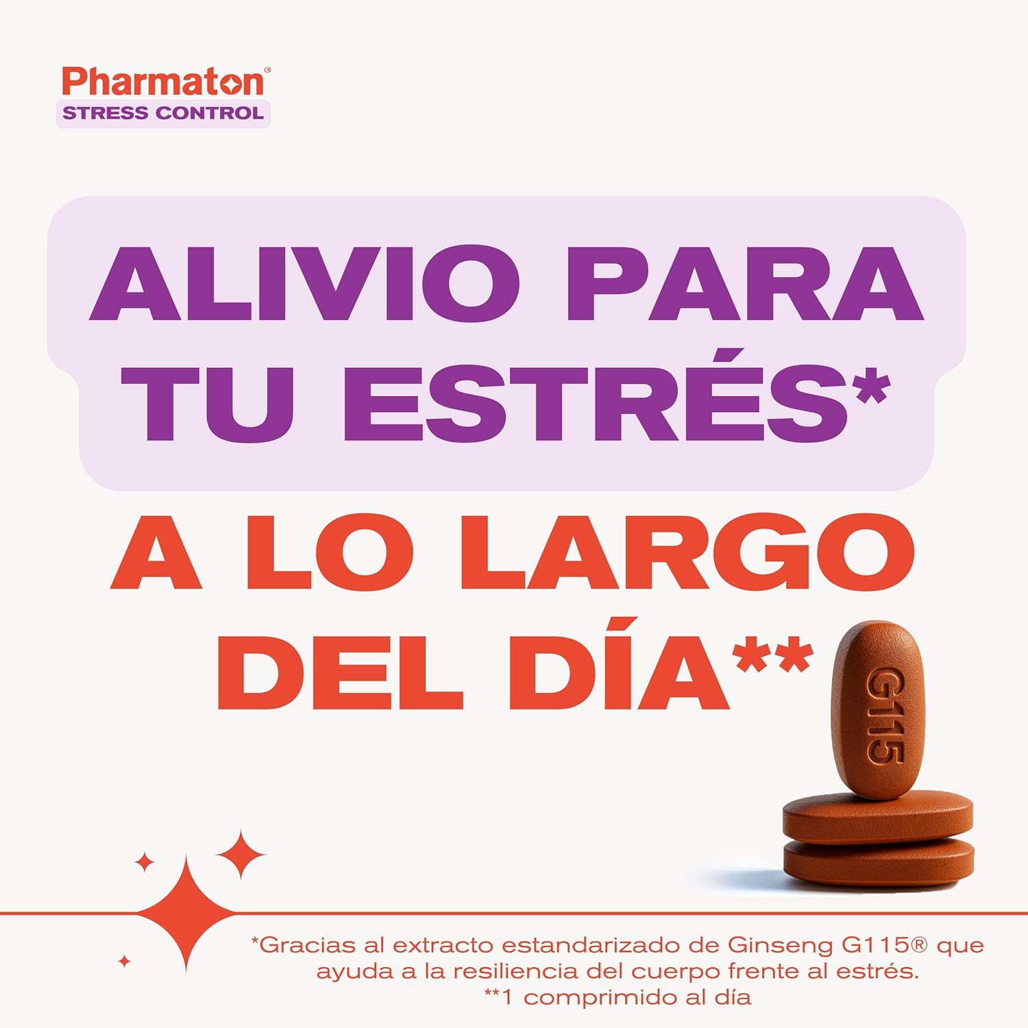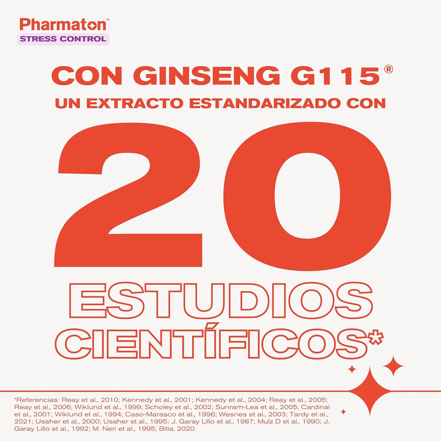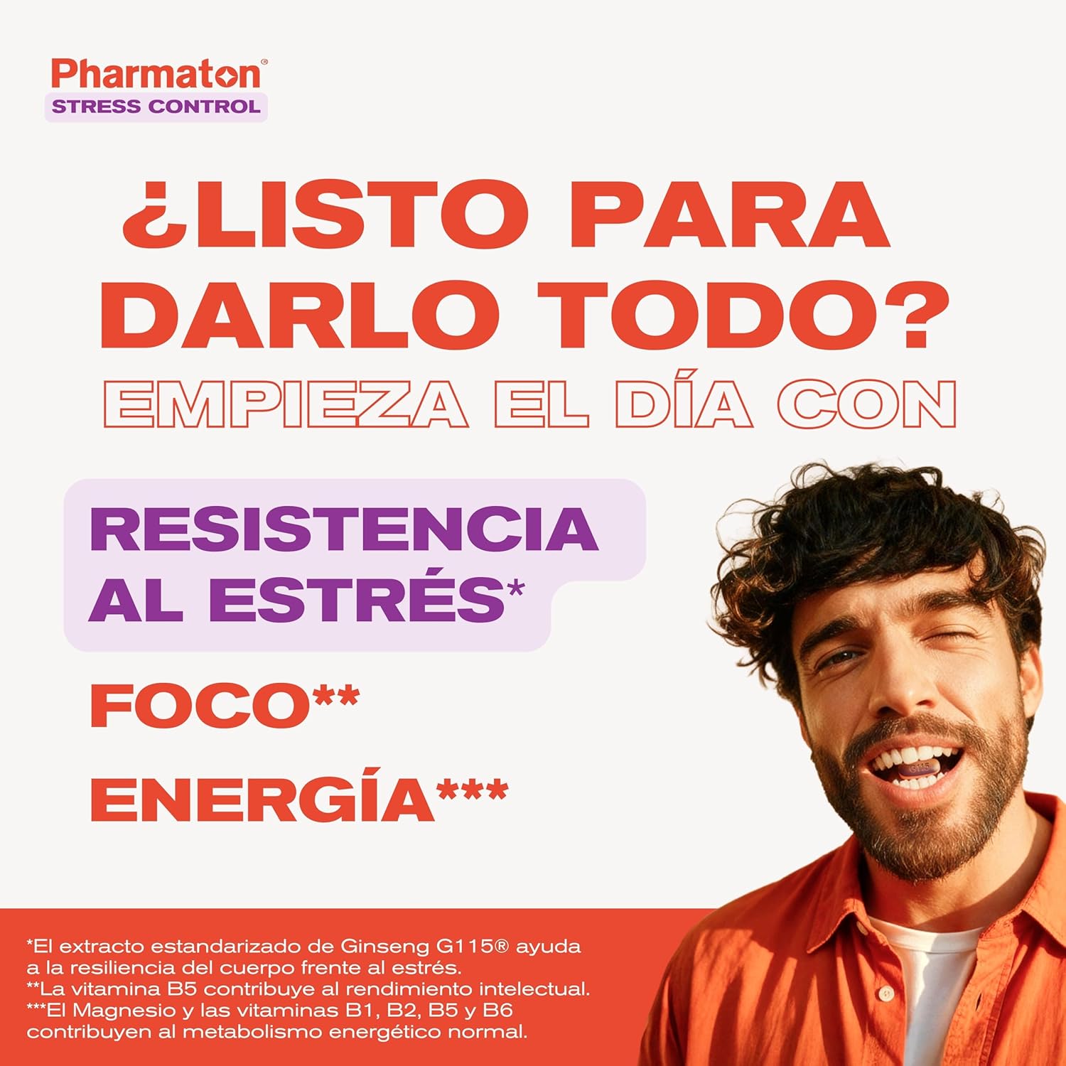 Pharmaton® Stress Control es un suplemento nutricional diseñado para ayudar a manejar el estrés diario. Este producto contiene Ginseng G115®, que es conocido por sus propiedades adaptogénicas, así como Magnesio y vitaminas del grupo B. Estas sustancias trabajan en conjunto para apoyar el bienestar general y la salud mental.