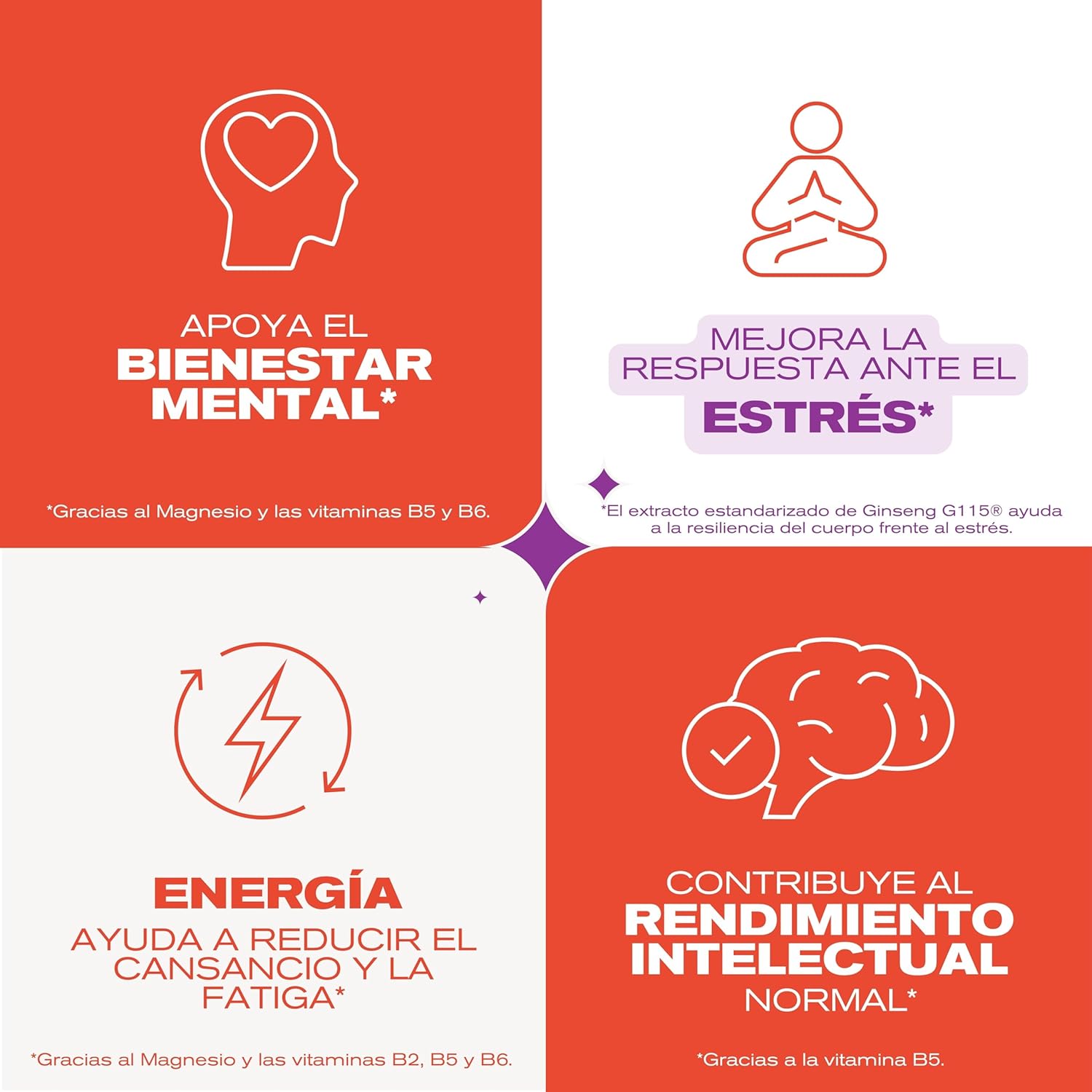 - Contiene Ginseng G115® para ayudar a combatir el estrés.