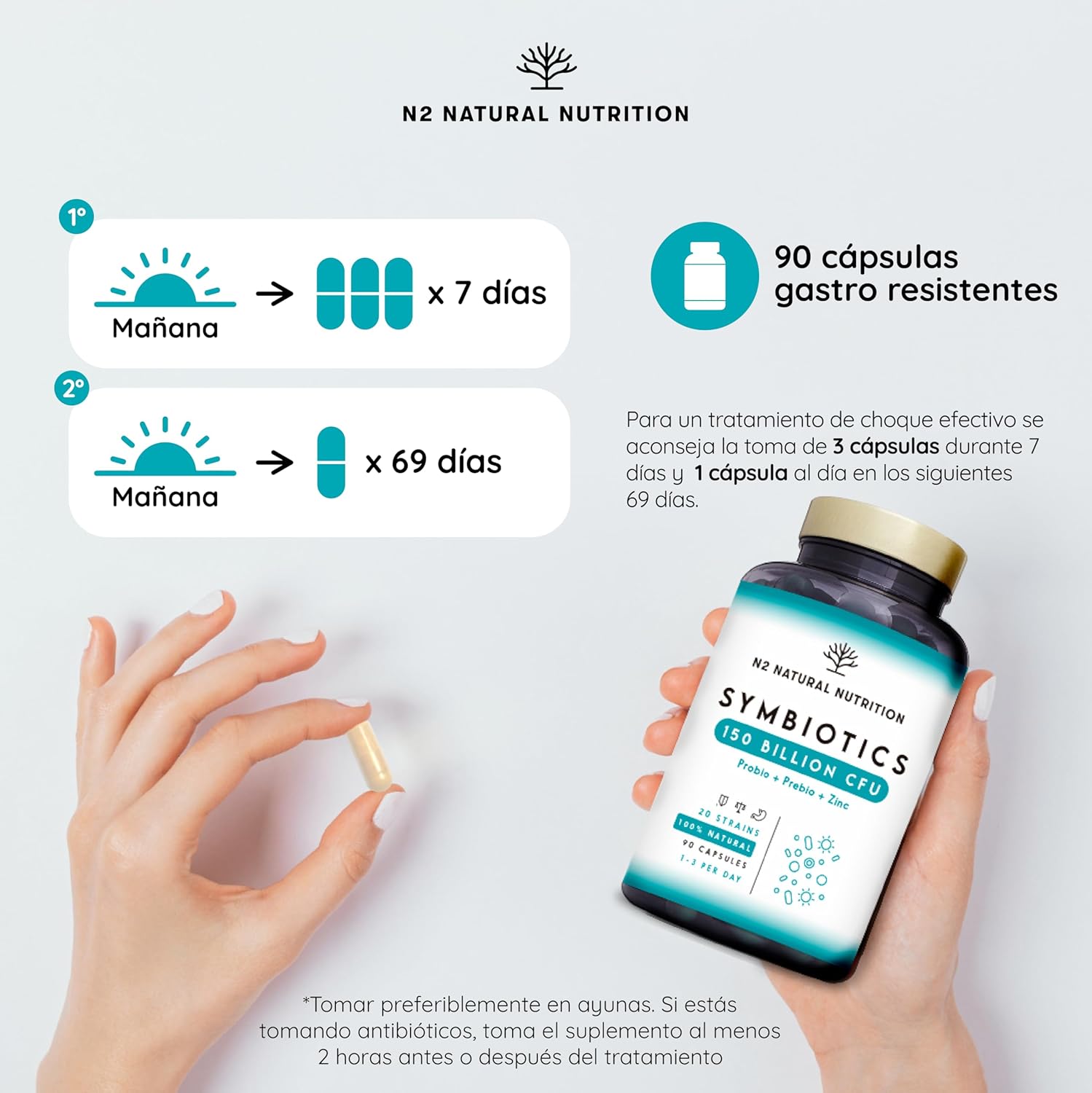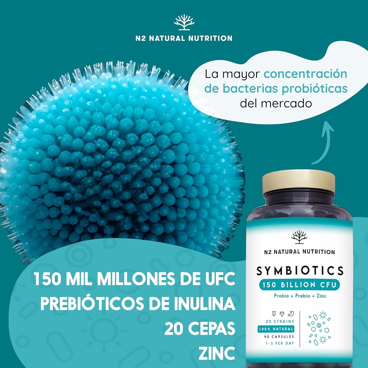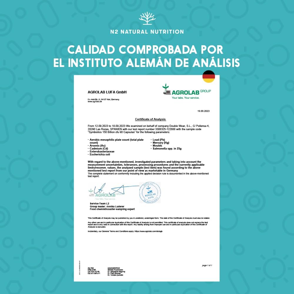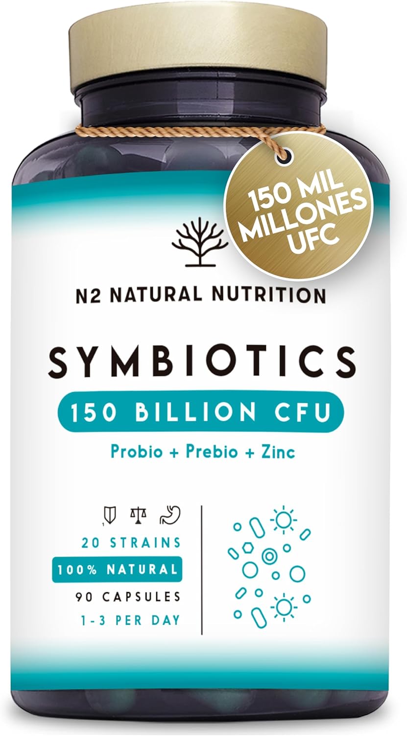 Probiotics 150 Billion CFU and 20 Strains. Maximum Concentration of Intestinal Probiotics and Prebiotics and Zinc. Shock Therapy 76 Days. Irritable Colon and Gases. Vegan. CE. N2 Natural Nutrition