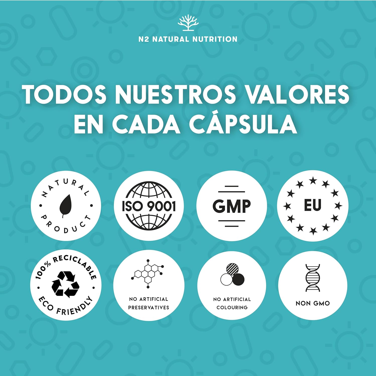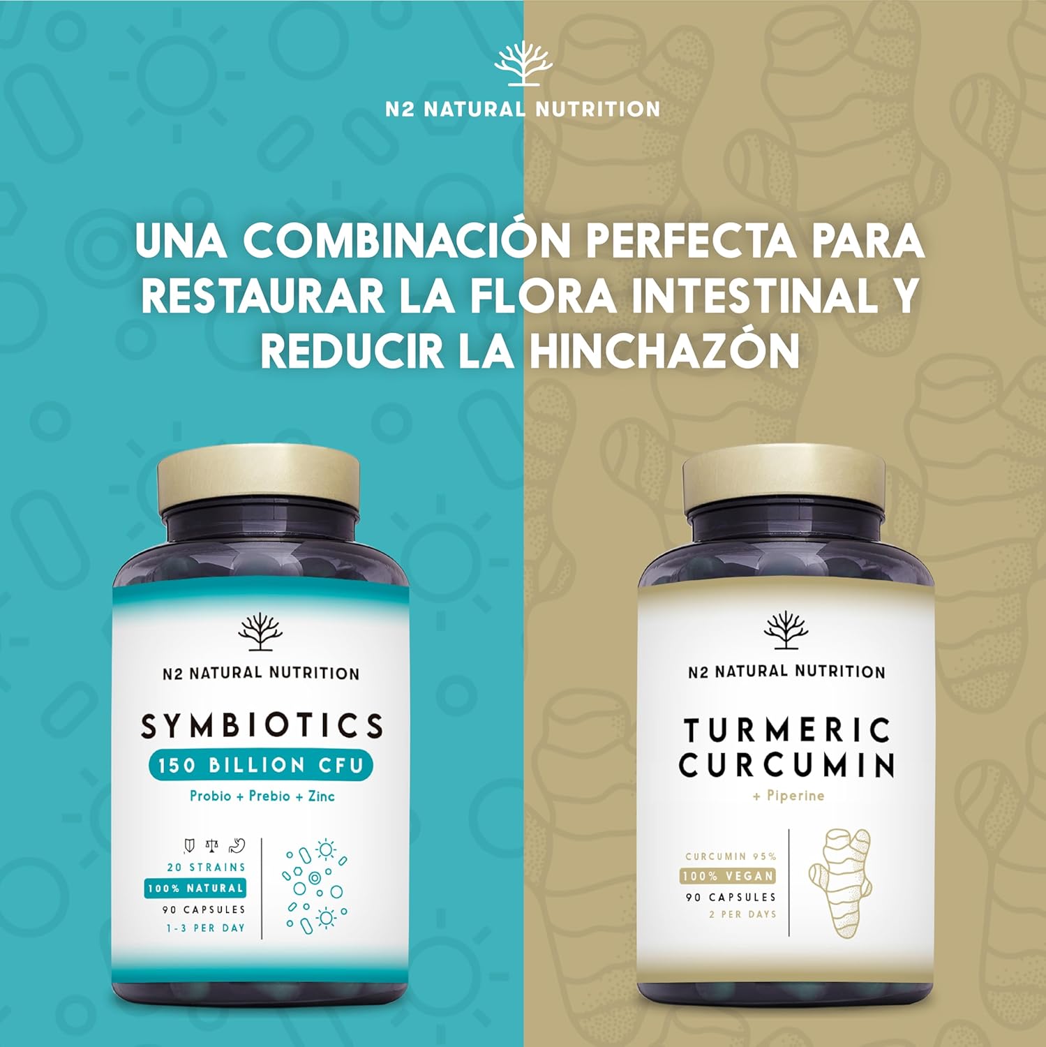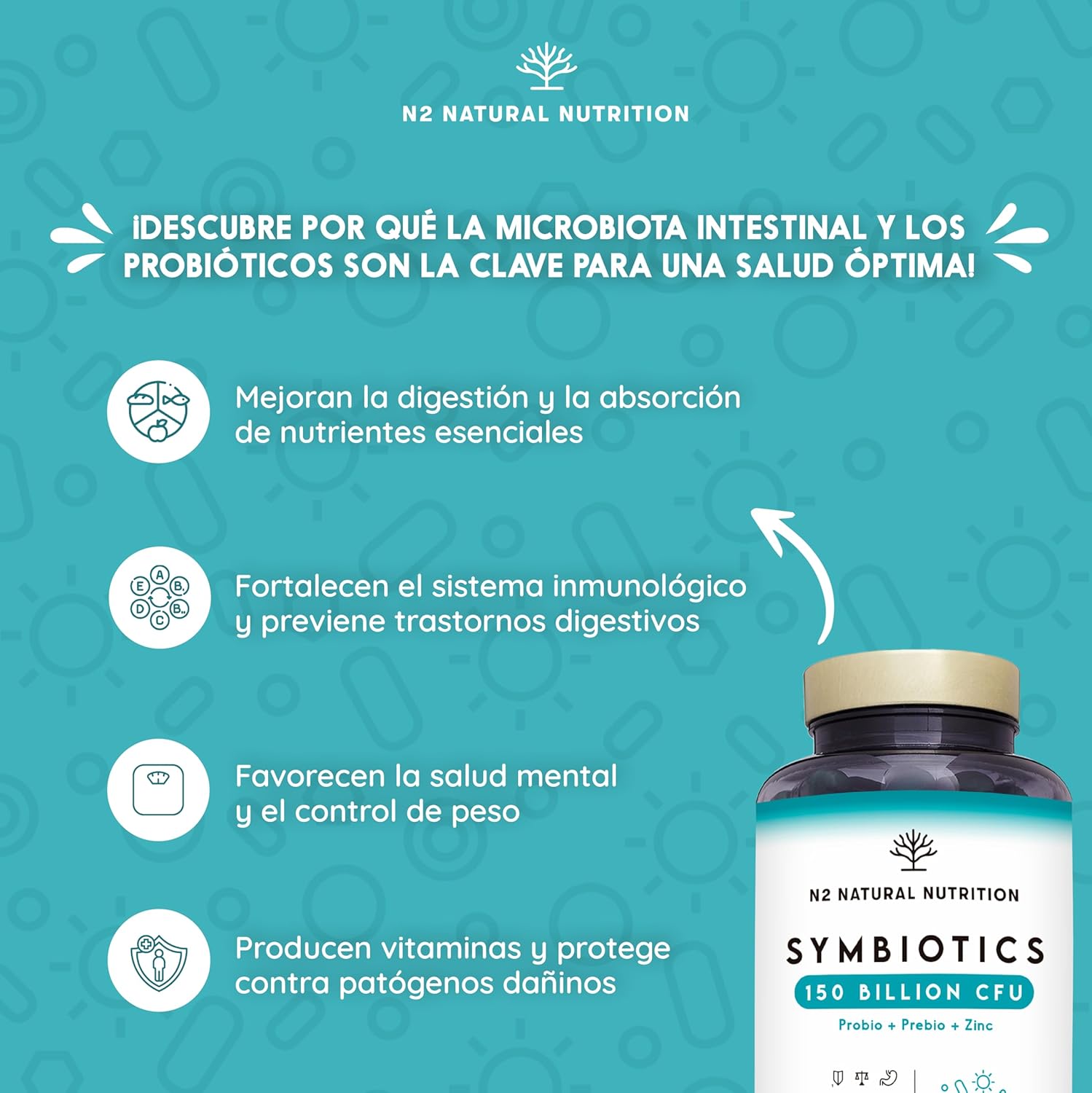 Probiotics 150 Billion CFU and 20 Strains. Maximum Concentration of Intestinal Probiotics and Prebiotics and Zinc. Shock Therapy 76 Days. Irritable Colon and Gases. Vegan. CE. N2 Natural Nutrition