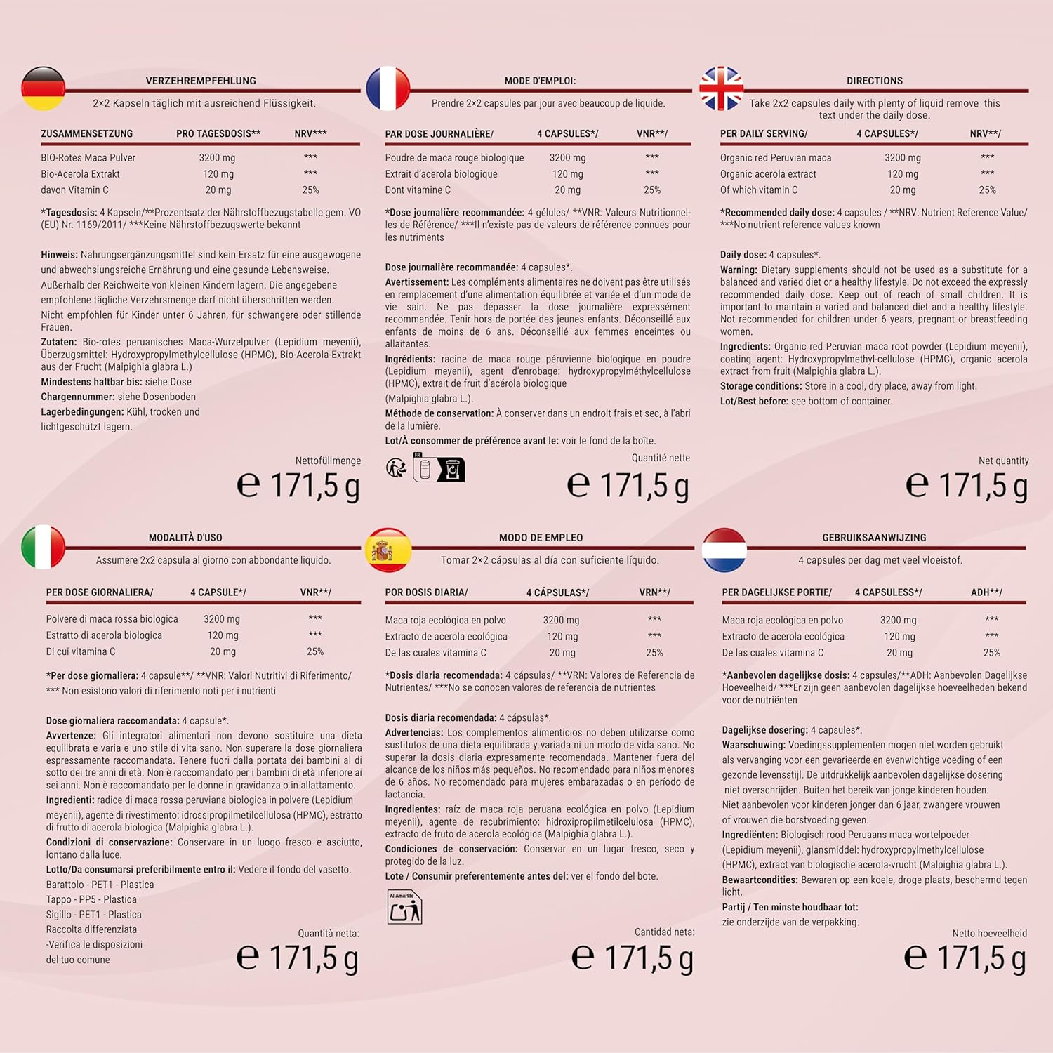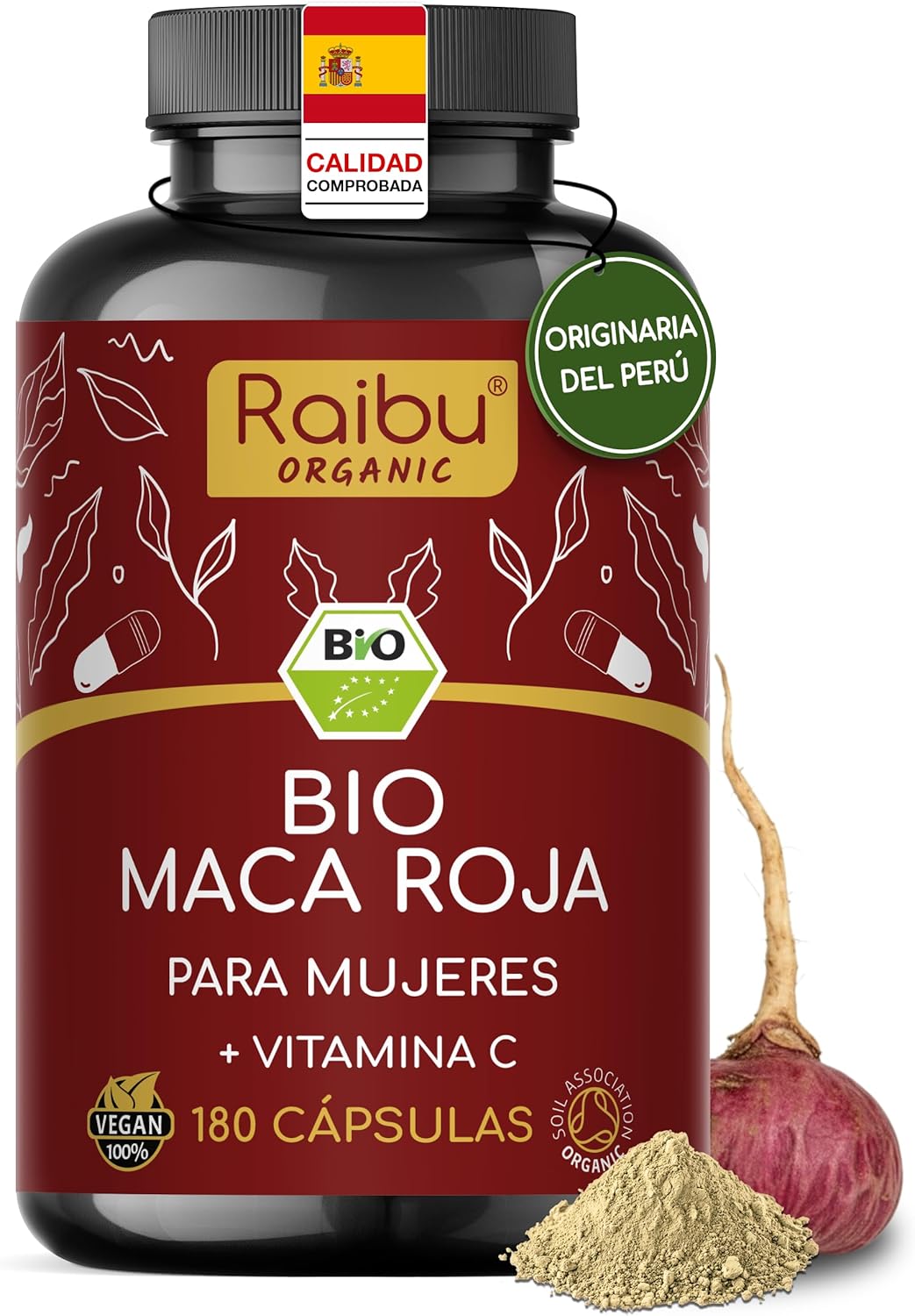 Red Maca BIO Peruana – 180 capsules of Red Maca with vitamin C – Vitality and feminine balance – 3,200 mg per daily dose (equivalent to 12,800 mg of Peru root) – Certified organic