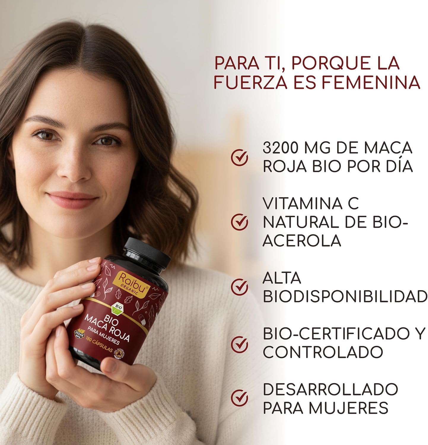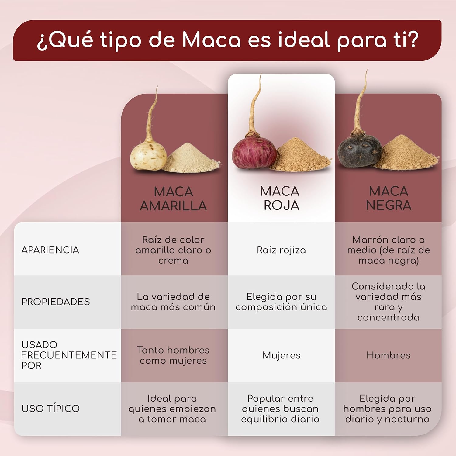 La maca roja es conocida por mejorar la vitalidad, el equilibrio hormonal y el bienestar general en las mujeres.
