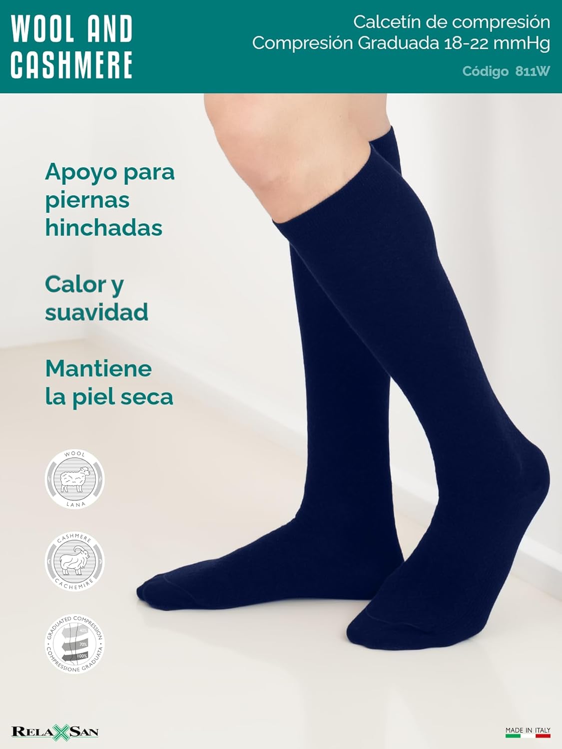 Los calcetines de compresión Relaxsan, elaborados con lana y cachemira, son una opción ideal para quienes buscan comodidad y soporte. Fabricados en Italia, estos calcetines están diseñados para proporcionar bienestar durante todo el día. Gracias a la selección cuidadosa de tejidos, ofrecen una combinación perfecta de calidez y transpirabilidad.