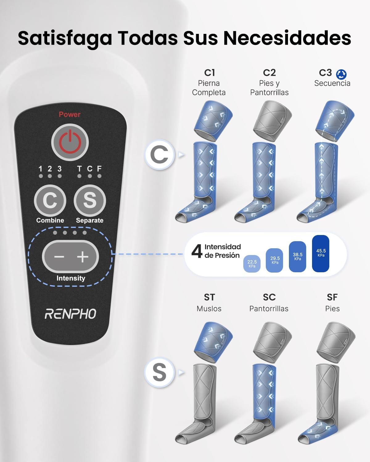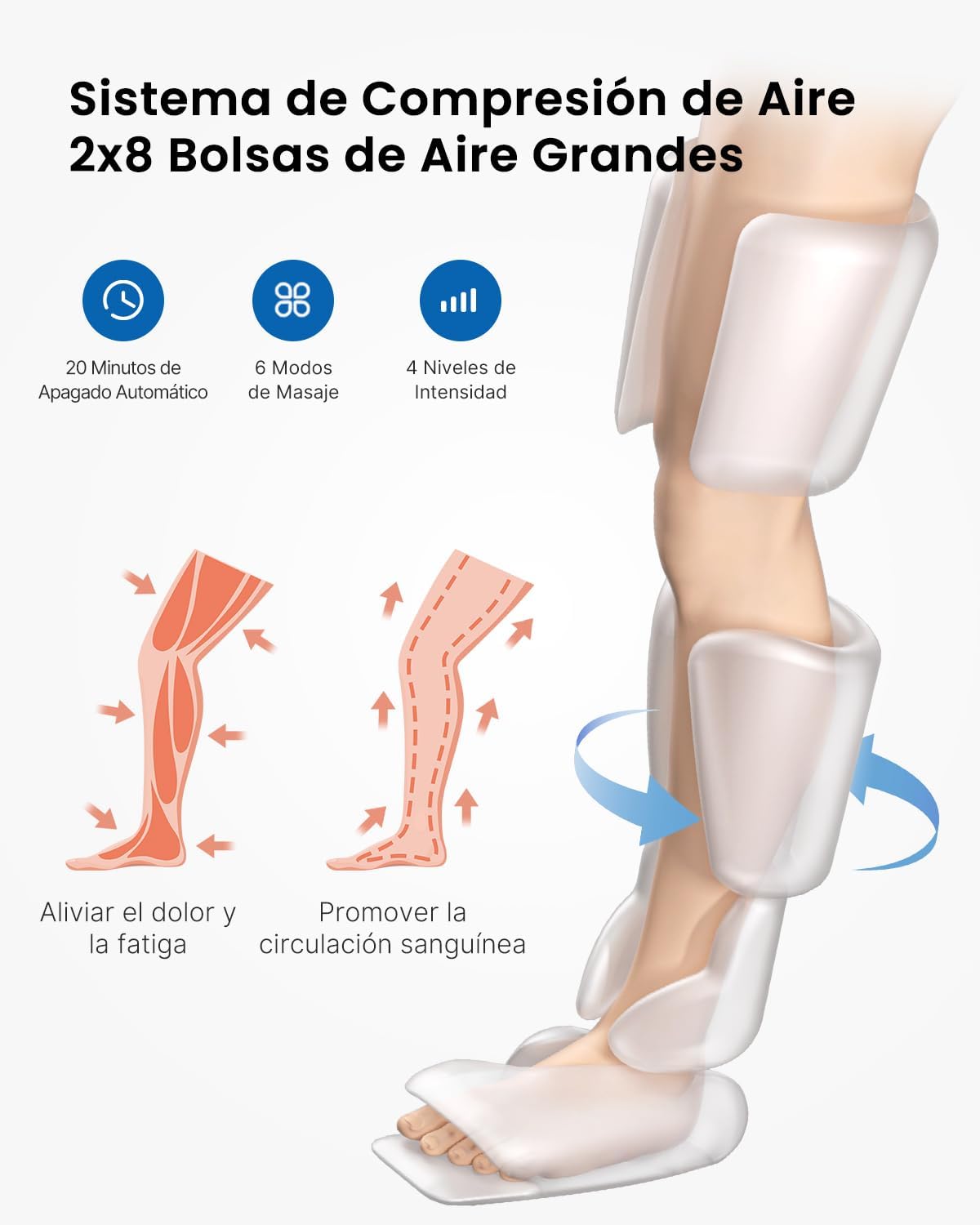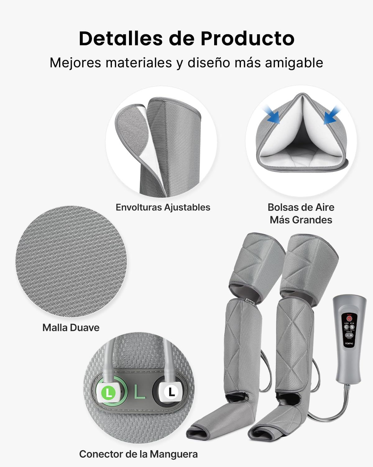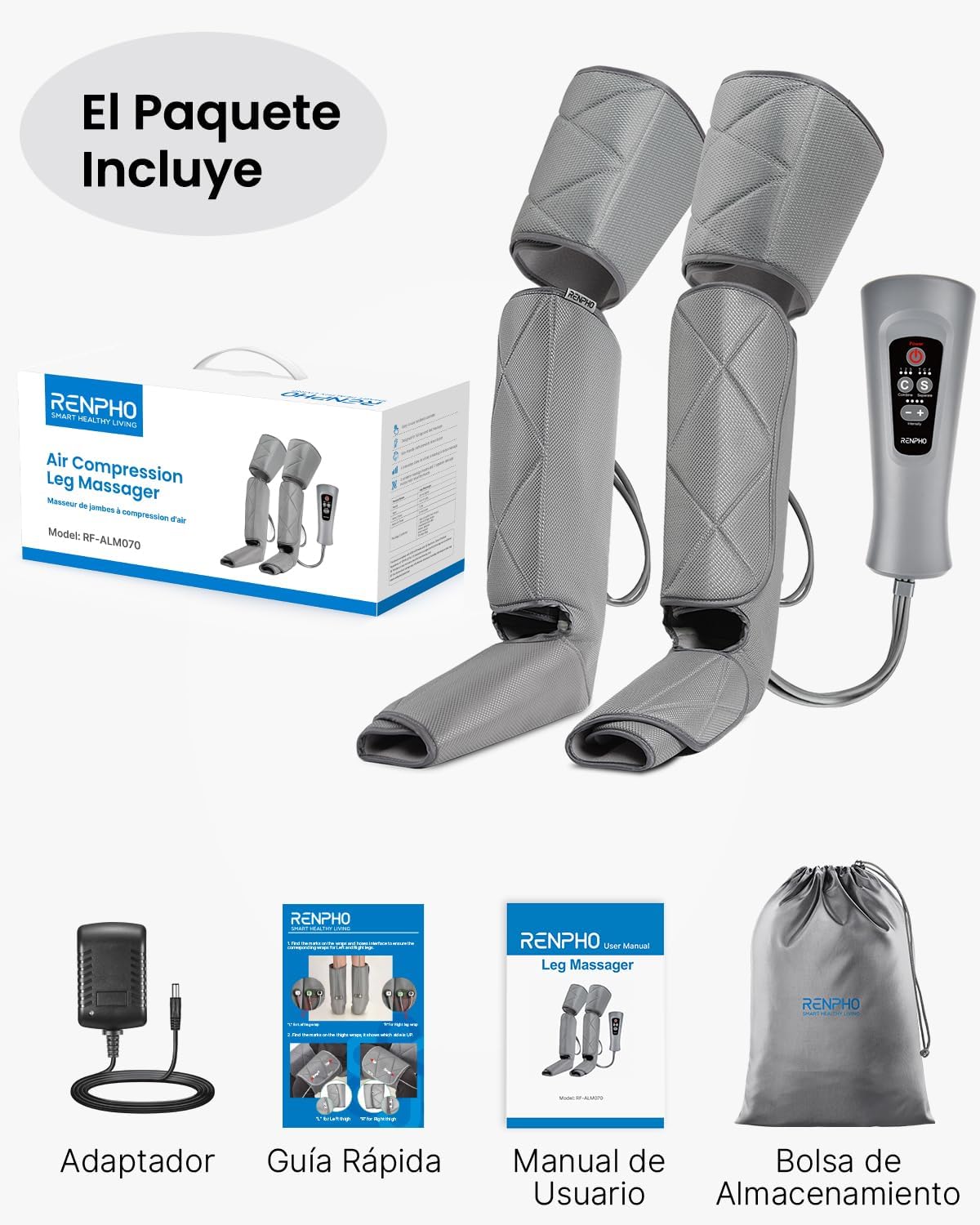 El masajeador de piernas RENPHO utiliza compresión de aire para proporcionar un masaje efectivo y relajante en las pantorrillas, muslos y pies. Con 6 modos y 4 intensidades, este dispositivo se adapta a tus necesidades específicas. Es ideal para quienes pasan mucho tiempo de pie o desean aliviar la tensión muscular.