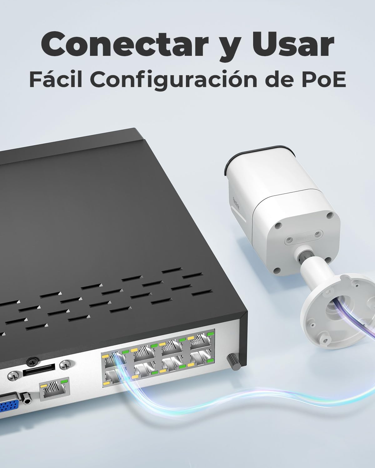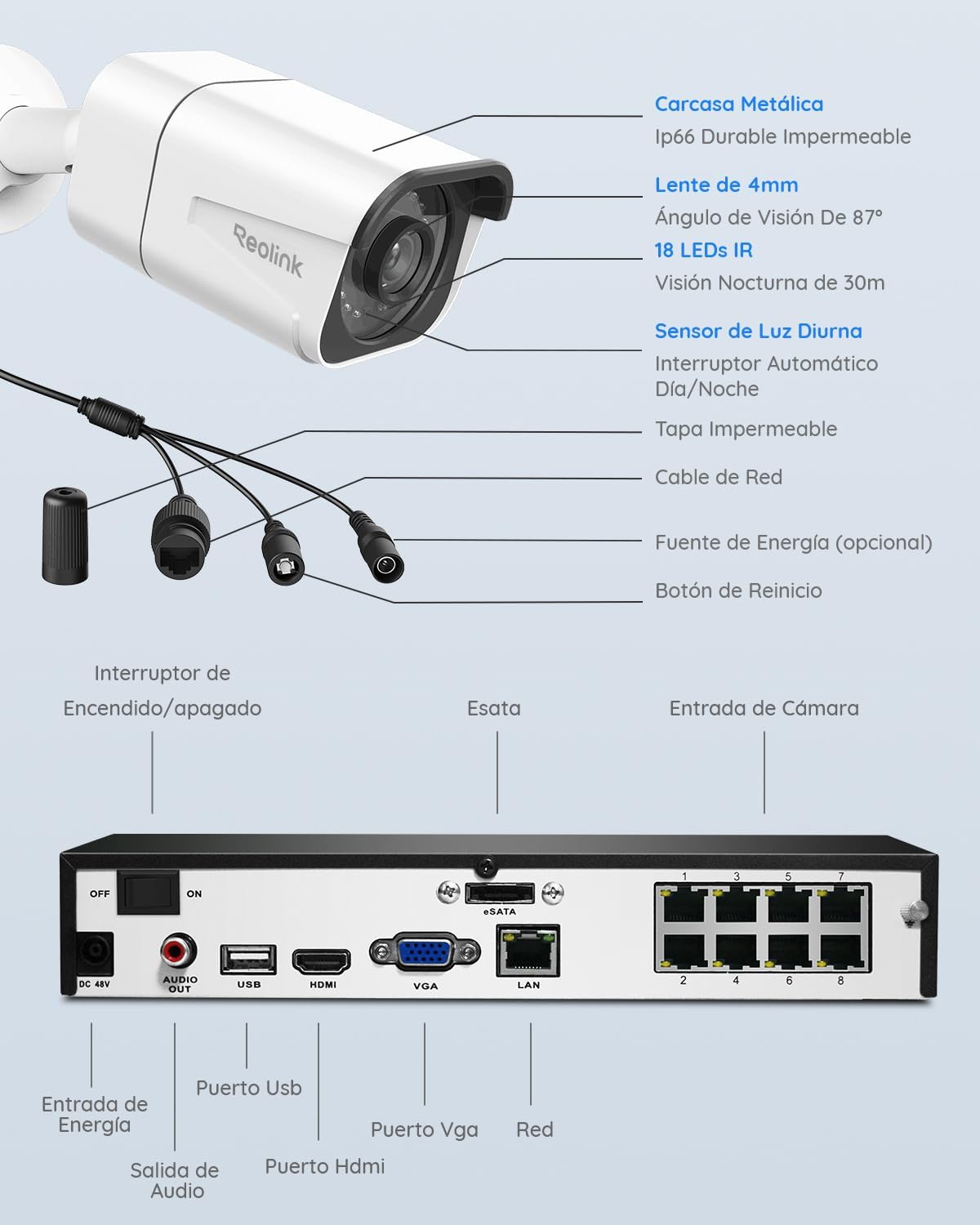 El kit de cámaras de seguridad Reolink 4K incluye cuatro cámaras IP PoE diseñadas para la vigilancia exterior. Este sistema cuenta con un NVR de 8 canales y un disco duro de 2TB, permitiendo grabaciones continuas las 24 horas. Las cámaras son resistentes al agua con clasificación IP67, lo que las hace adecuadas para diversas condiciones climáticas.