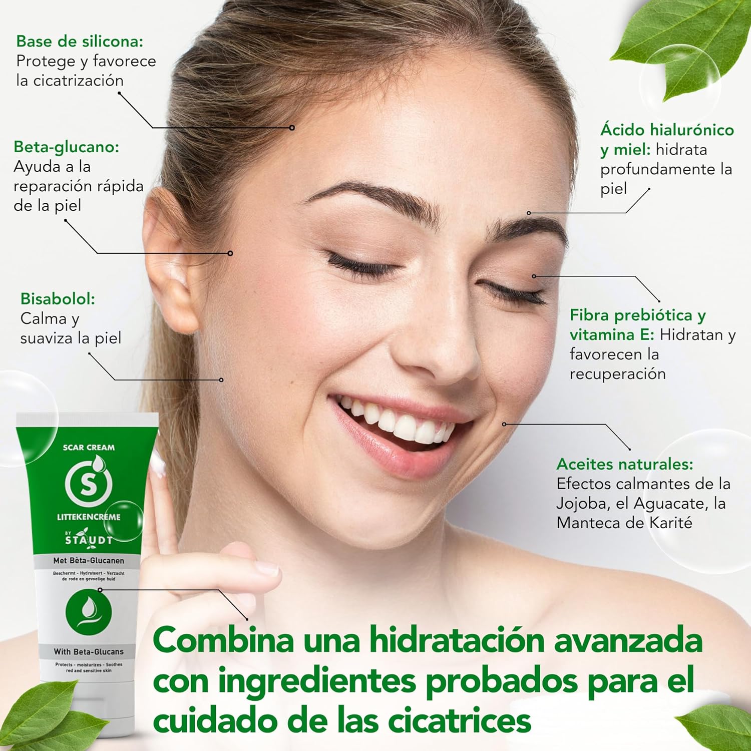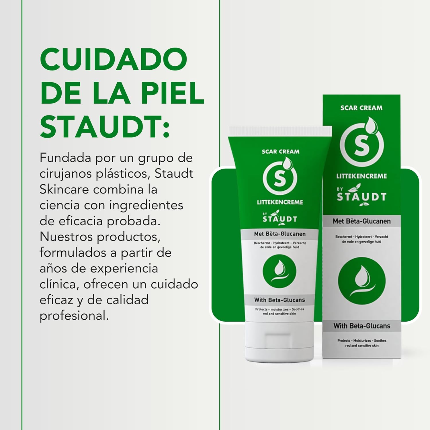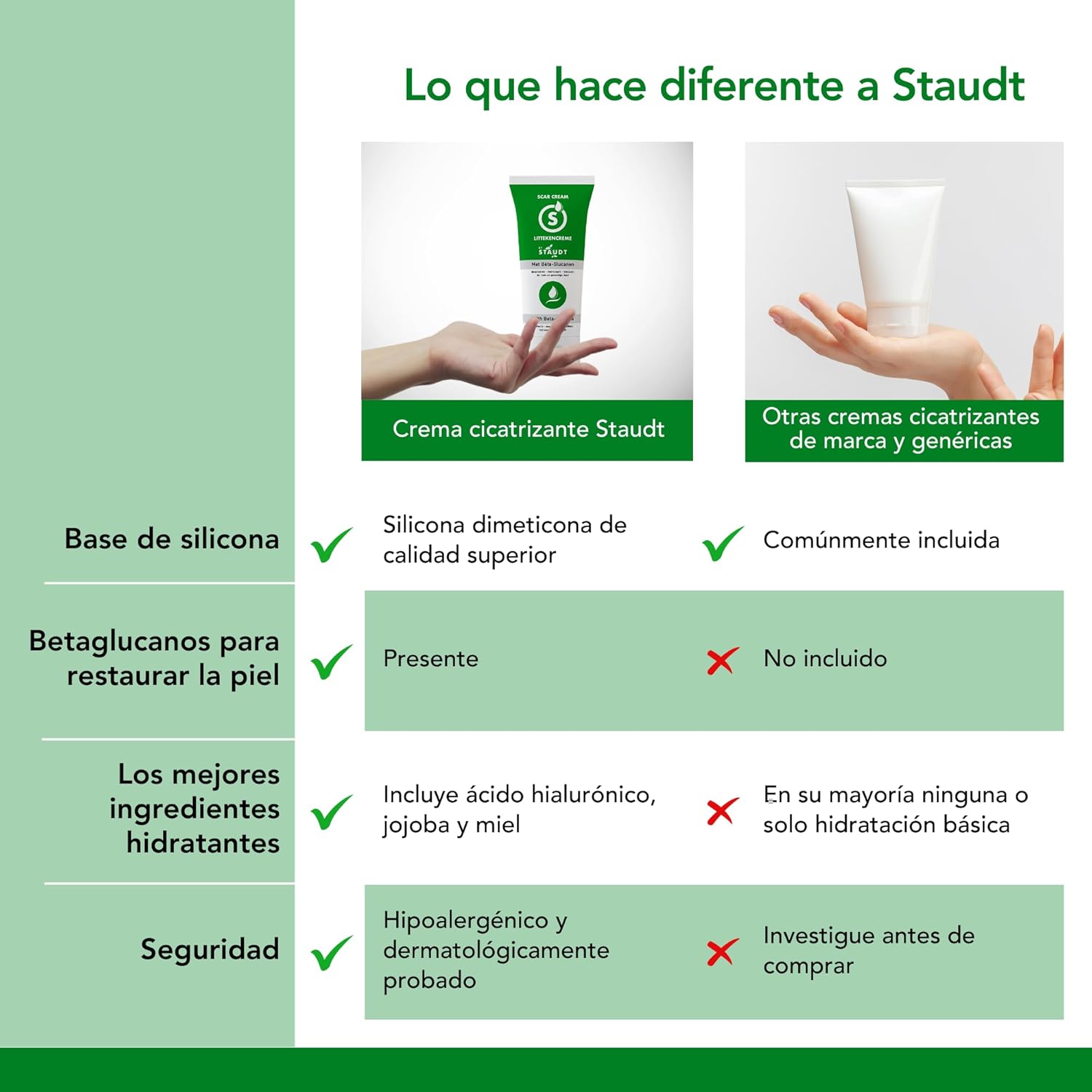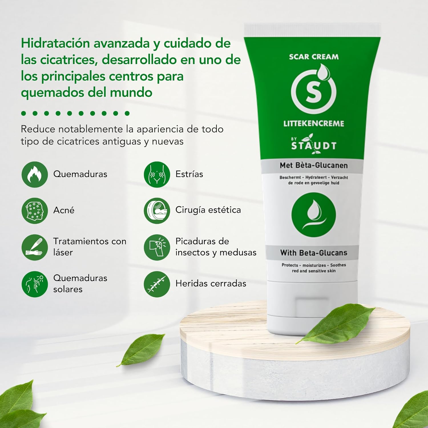 La Crema Sanadora Premium Staudt es una solución innovadora para mejorar la apariencia de cicatrices, gracias a su fórmula con Vitamina E, Miel, Ácido Hialurónico y Silicona. Esta crema ha sido desarrollada en colaboración con pacientes que tienen cicatrices severas, asegurando que su efectividad se base en experiencias reales. Ideal para el tratamiento de: