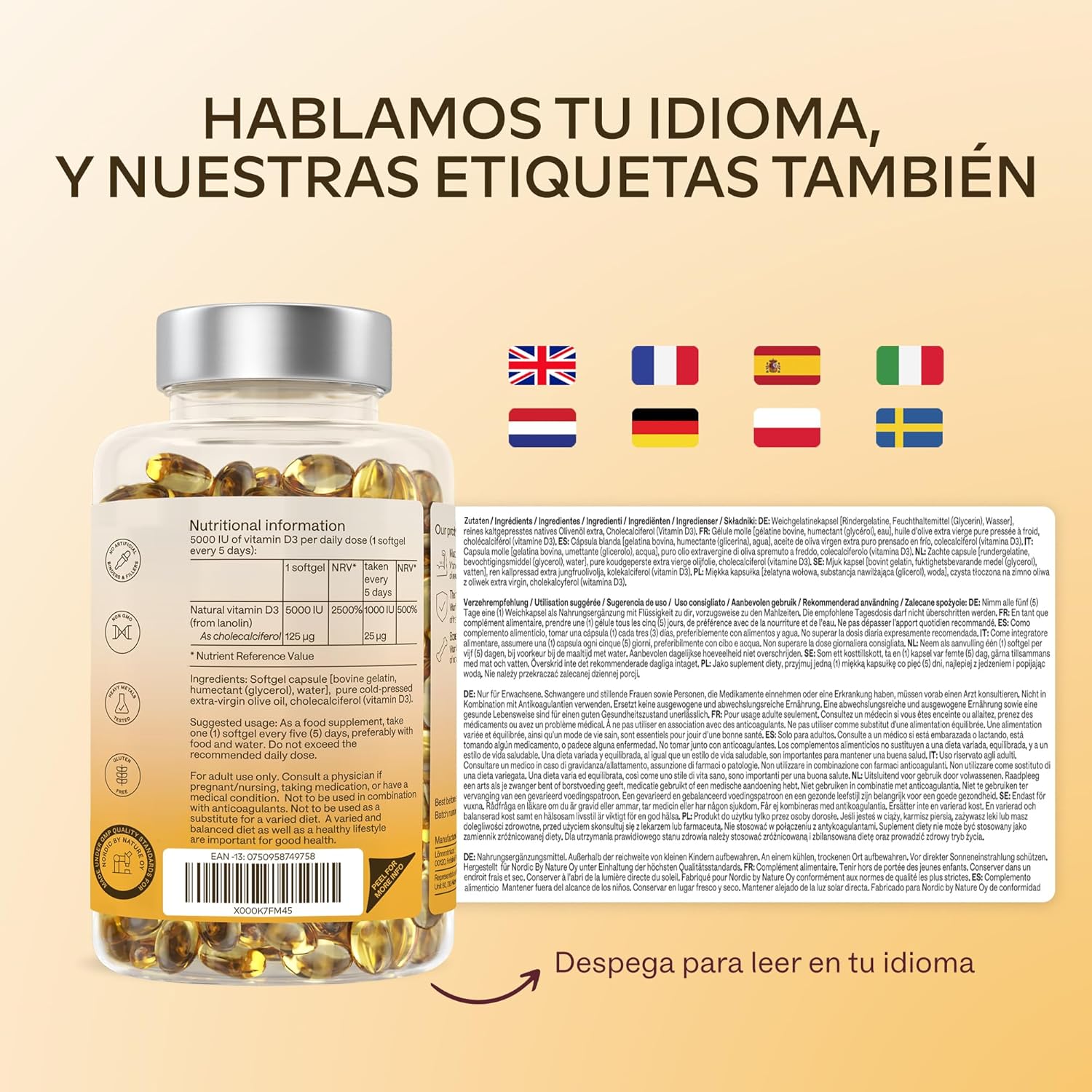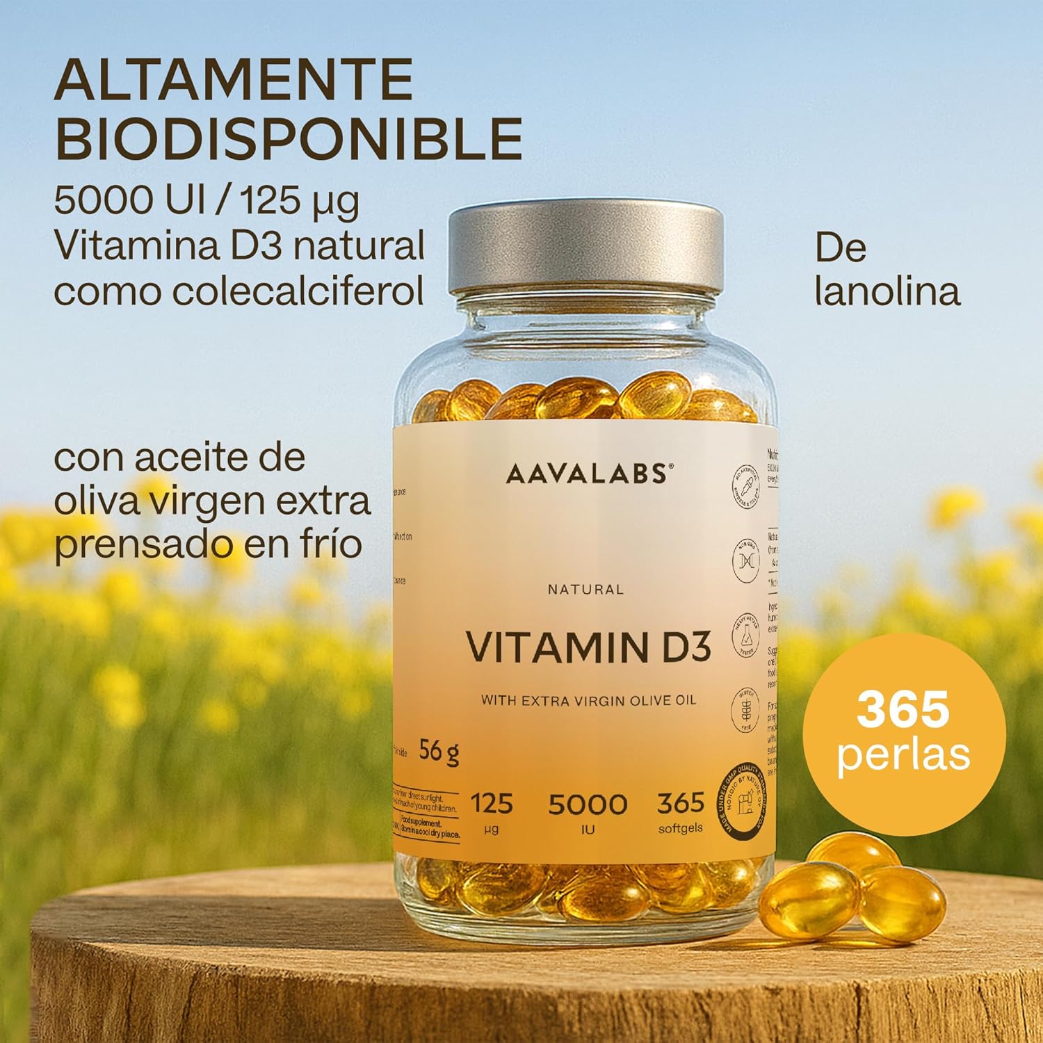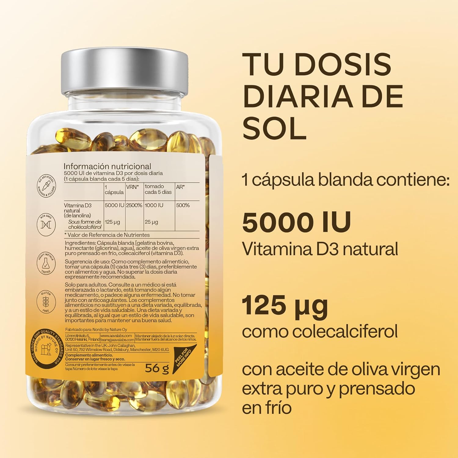- Contiene 5000 IU de vitamina D3 por cápsula.