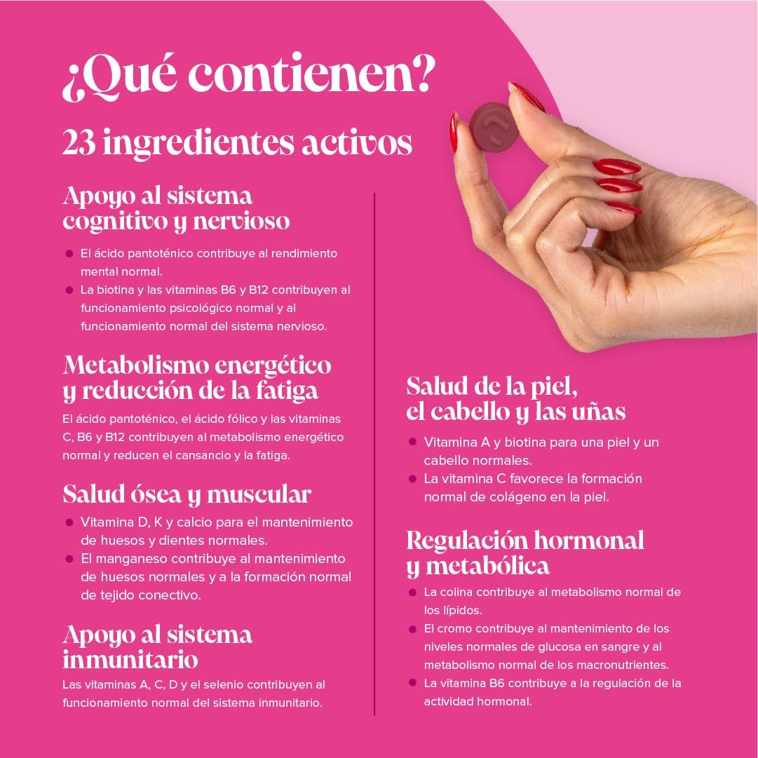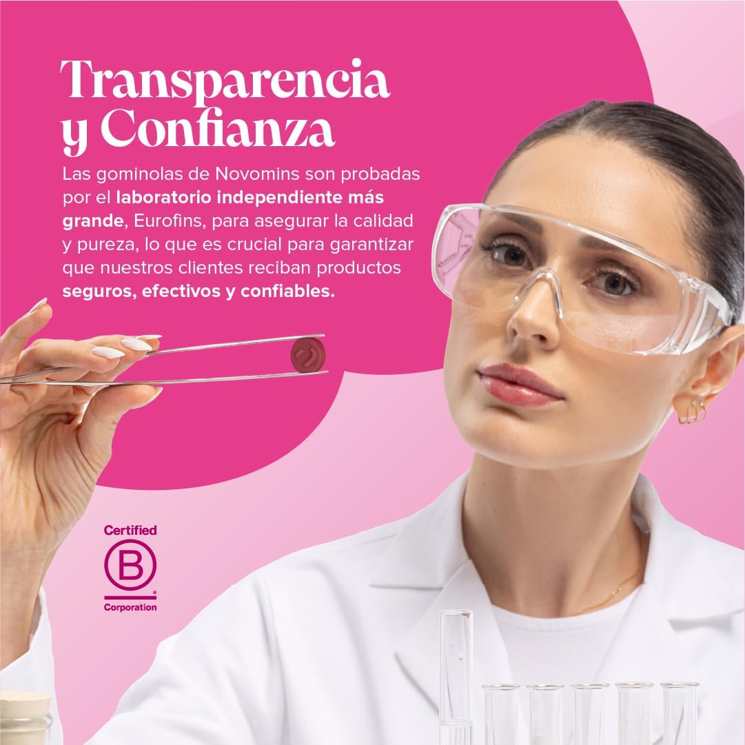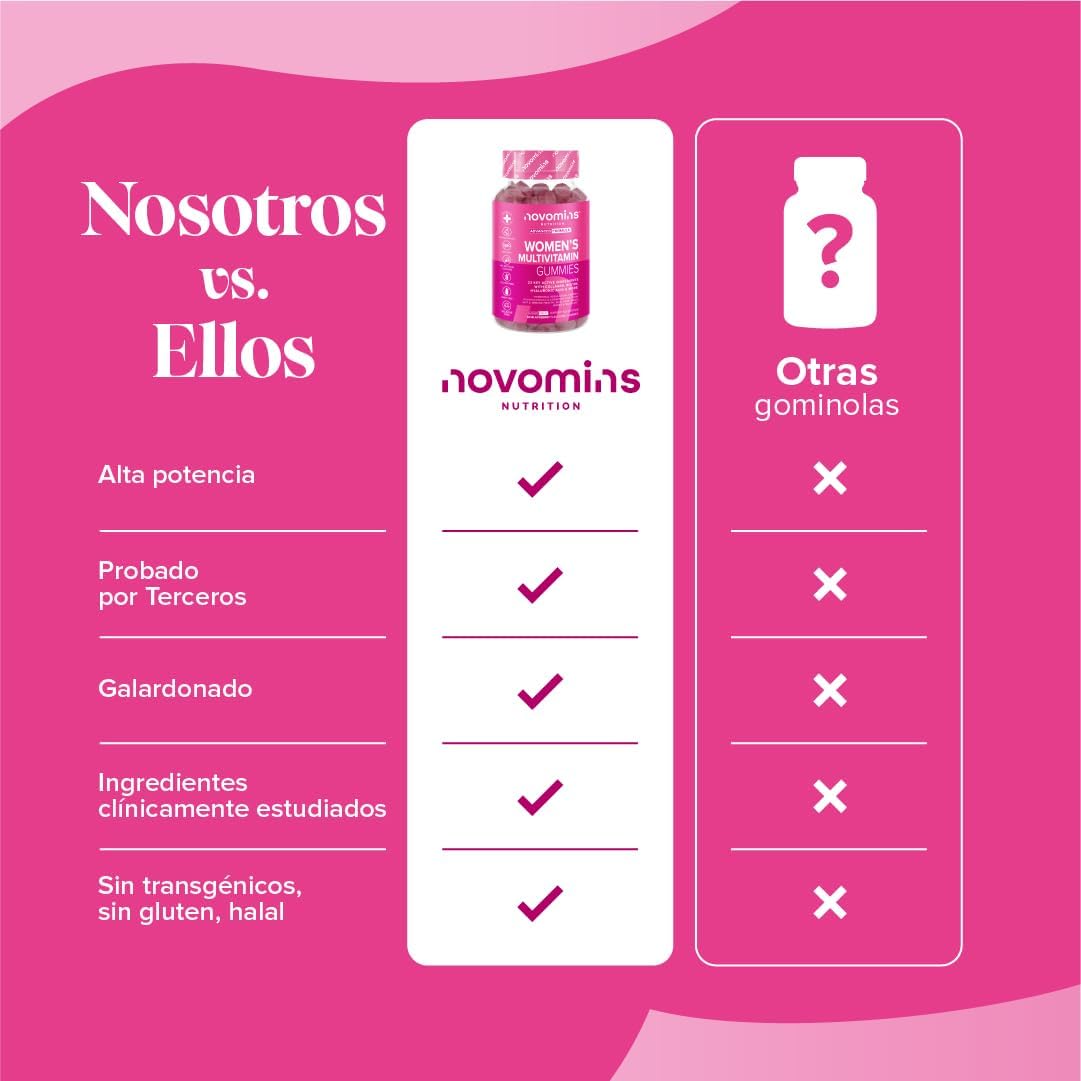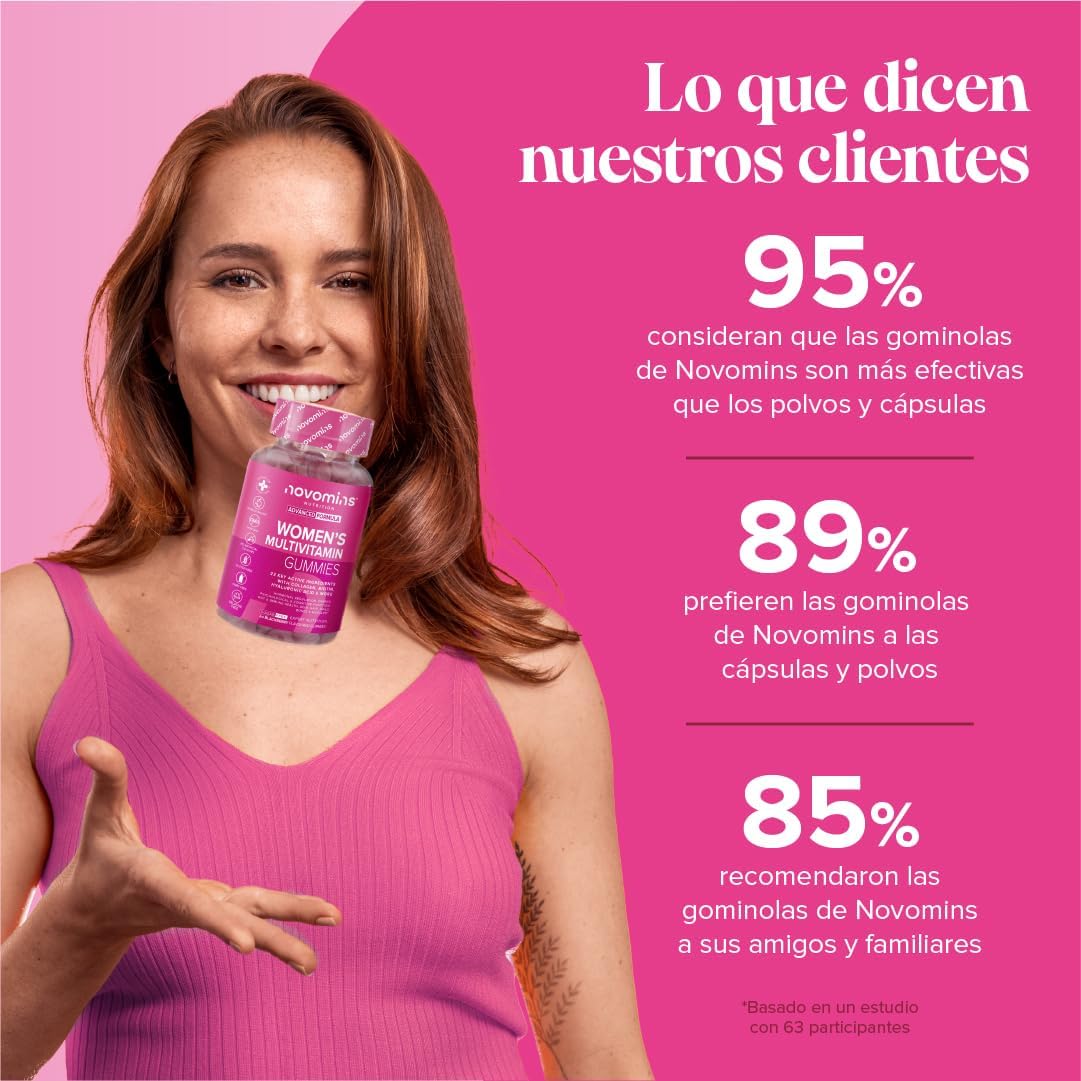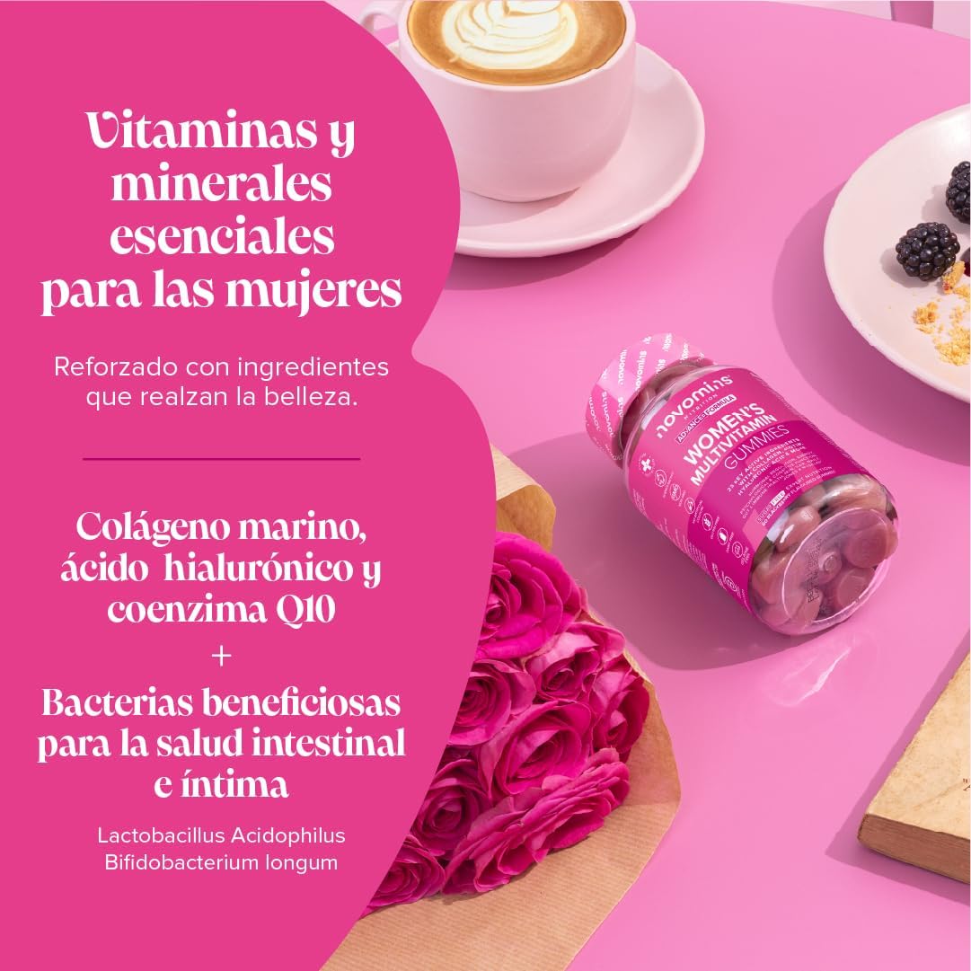 Los multivitamínicos para mujeres de Novomins son una opción conveniente y deliciosa para complementar tu dieta diaria. Cada frasco contiene 60 gomitas que incluyen una mezcla de vitaminas y minerales esenciales. Estos multivitamínicos están formulados con ingredientes como colágeno marino y ácido hialurónico, que pueden contribuir a la salud del cabello y la piel.