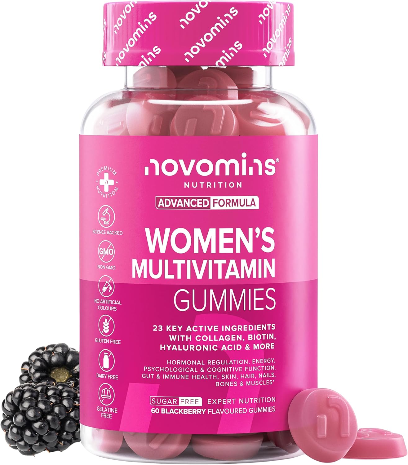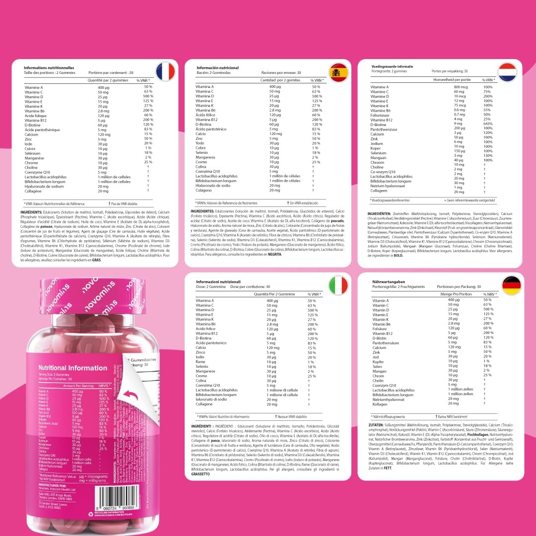 Women’s Multivitamins – 60 Gummies with Vitamins for Hair, Marine Collagen and Hyaluronic Acid – Vitamin C, A, D, B, Biotin and Zinc – Multivitamin with Minerals and Probiotics – Novomins